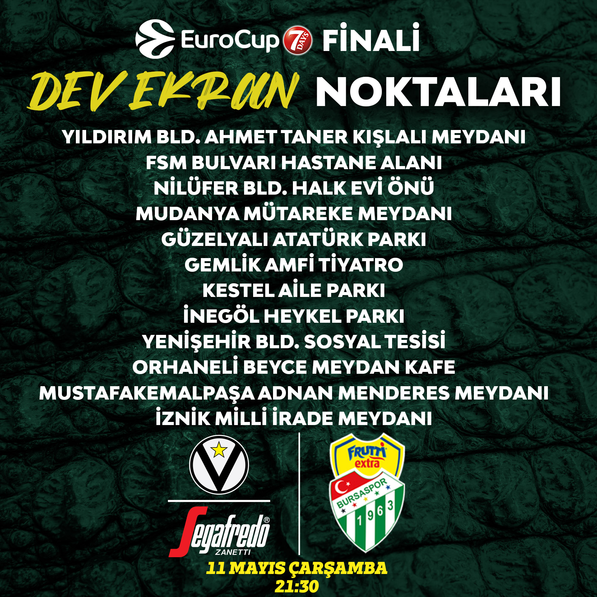 Frutti Extra Bursaspor’un bu akşam Virtus Segafredo Bologna ile oynanayacağı EuroCup finali için şehrin dört bir yanında dev ekranlar kurulacak.