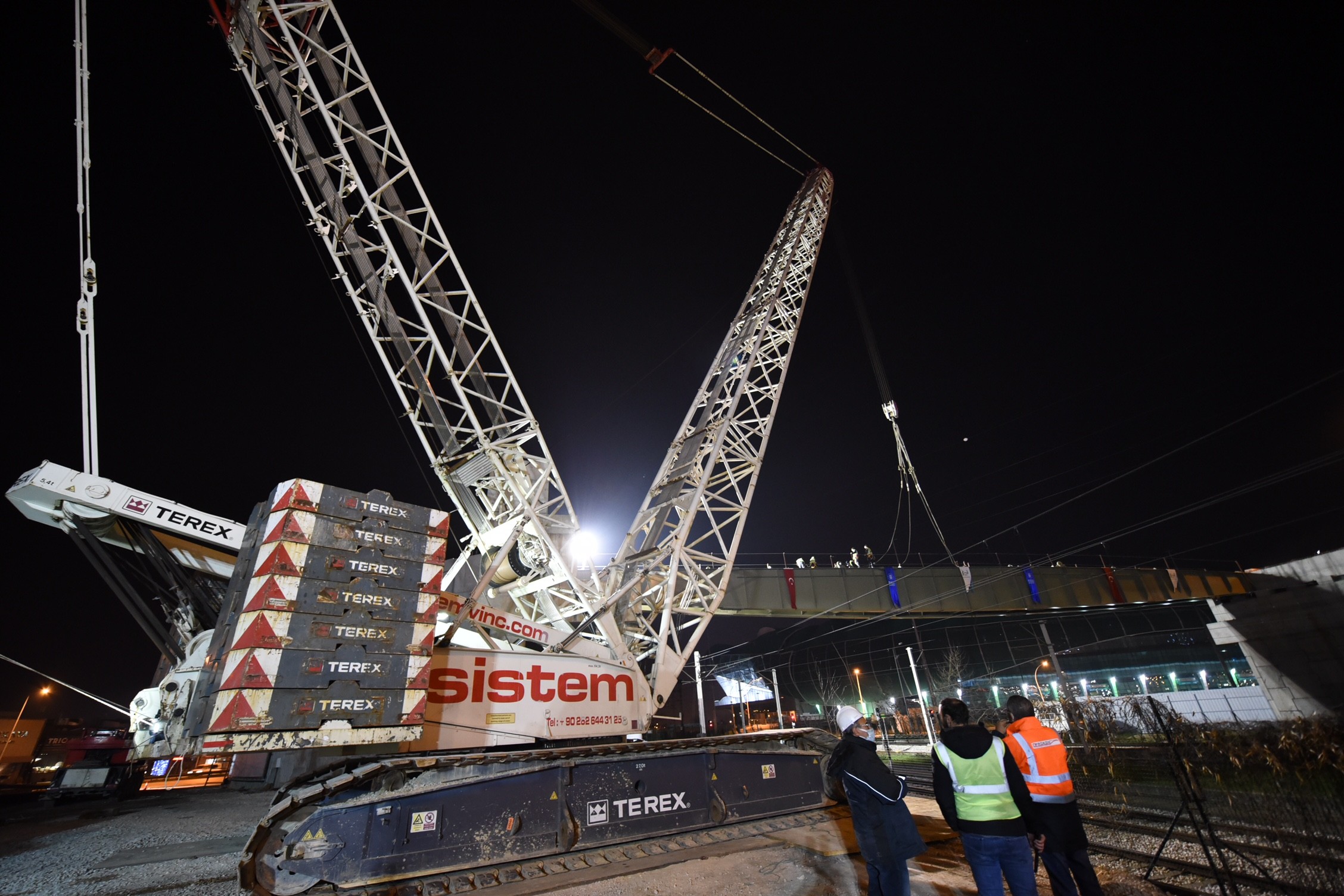 Dev vinçler yardımıyla yerinden kaldırılan köprü kirişlerinin montaji nefes kesti.