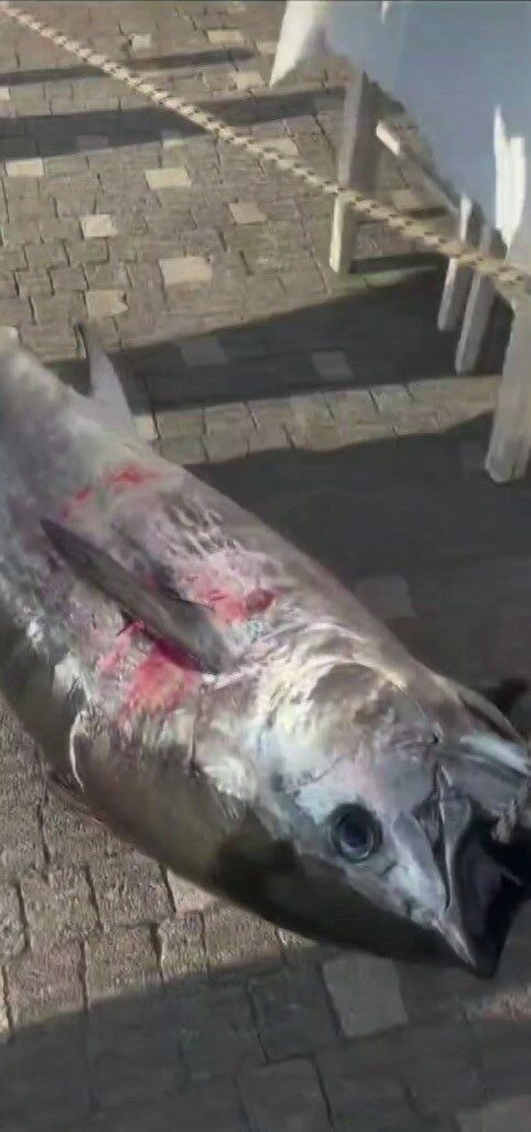 Balıkçıların tekneyle yaptığı takip sonrası orkinos balığı yaralı olarak tekneye alındı.