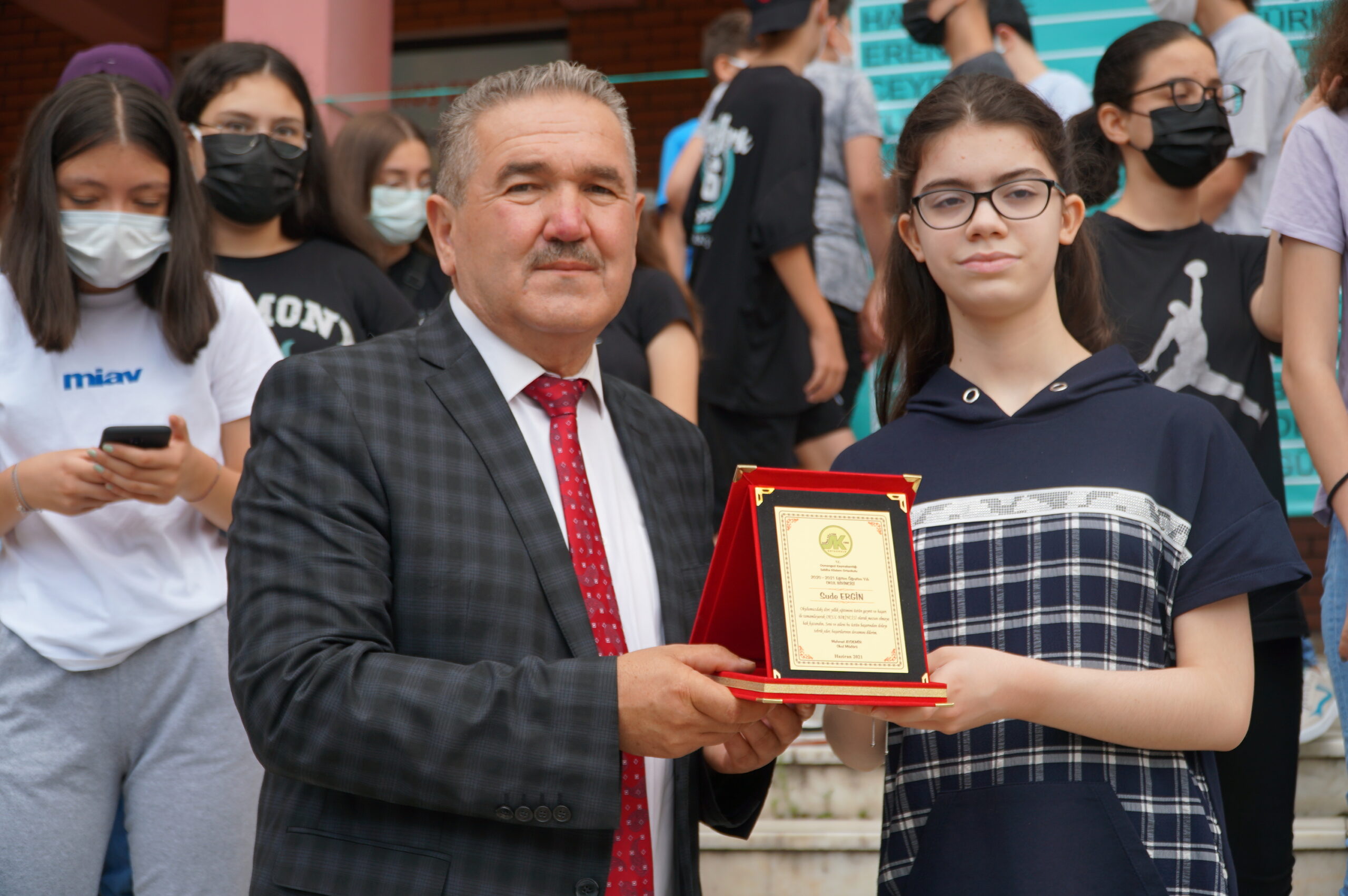 2 boş bırakarak diğer soruları doğru cevaplayan Sabiha Köstem Ortaokulu öğrencileri Sude Ergin, Zeynep Ay ve dereceye giren diğer öğrencilere Sabiha Köstem Ortaokulu Müdürü Mehmet Aydemir tarafından plaket verildi. Bursa’nın eğitiminin son zamanlarda Türkiye genelinde daha üst sıralara çıktığını belirten Okul Müdürü Mehmet Aydemir, Sabiha Köstem Ortaokulu’nun da son 6 yıldır başarılarını arttırarak devam ettiklerini söyledi.