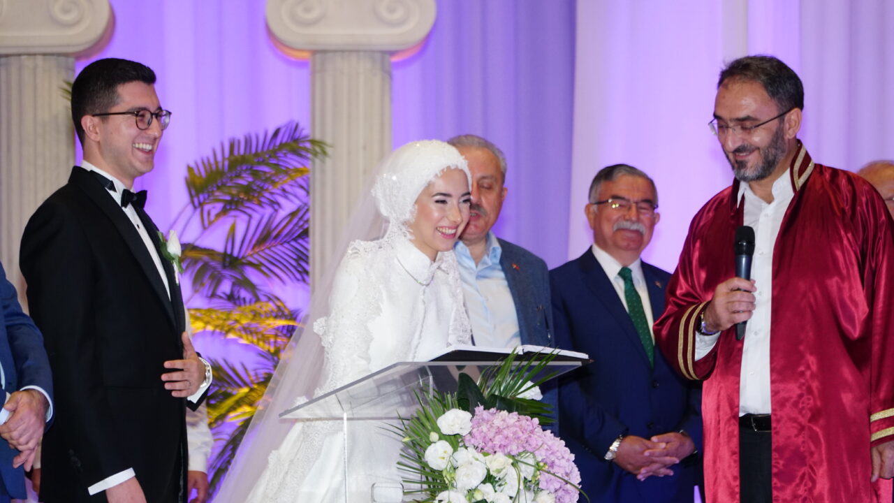 Merinos Atatürk Kongre ve Kültür Merkezi’nde gerçekleşen düğün törenine yoğun katılım oldu. Salona sığmayan kalabalıkta devlet erkanının önde gelen isimleri yer aldı.