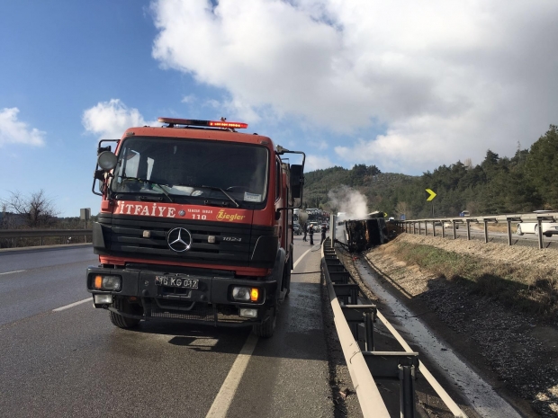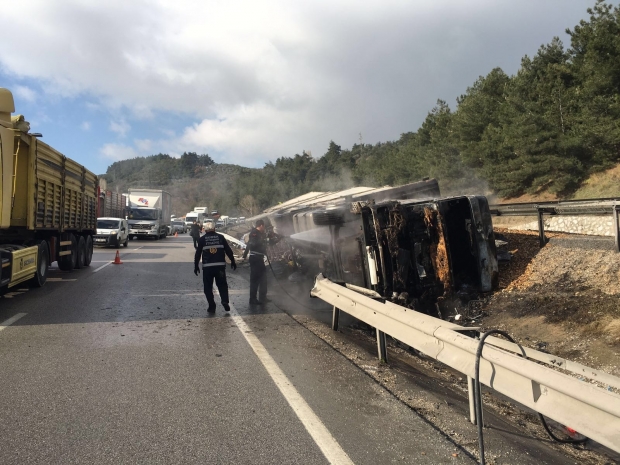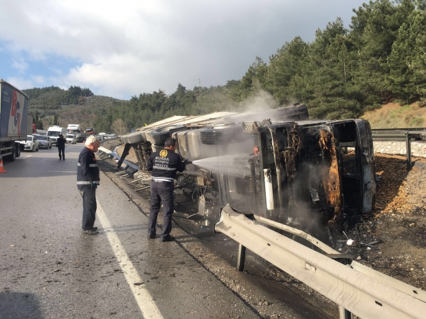 İstanbul istikametine seyir halinde olan talaş yüklü TIR, virajı alamayarak yan yattı. Birden alev alan TIR’ı söndürmek için itfaiye ekiplerine haber verildi.