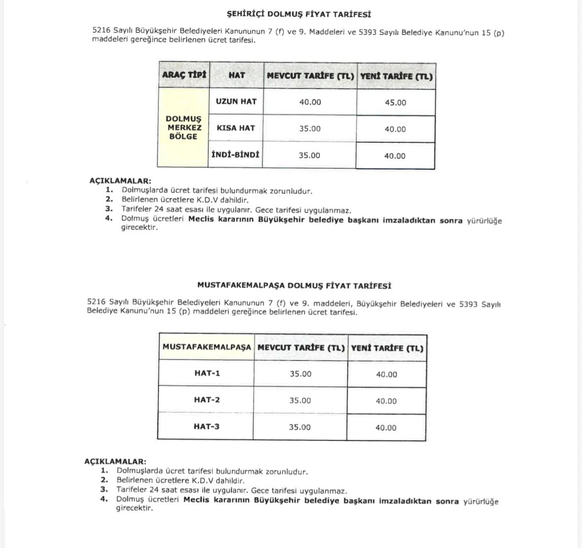 Öte yandan Mustafakemalpaşa ilçesinde de dolmuş ücretleri güncellendi. Yeni tarifeye göre Mustafakemalpaşa’da Hat-1, Hat-2 ve Hat-3 dolmuş ücretleri 35 TL’den 40 TL’ye çıkarıldı.