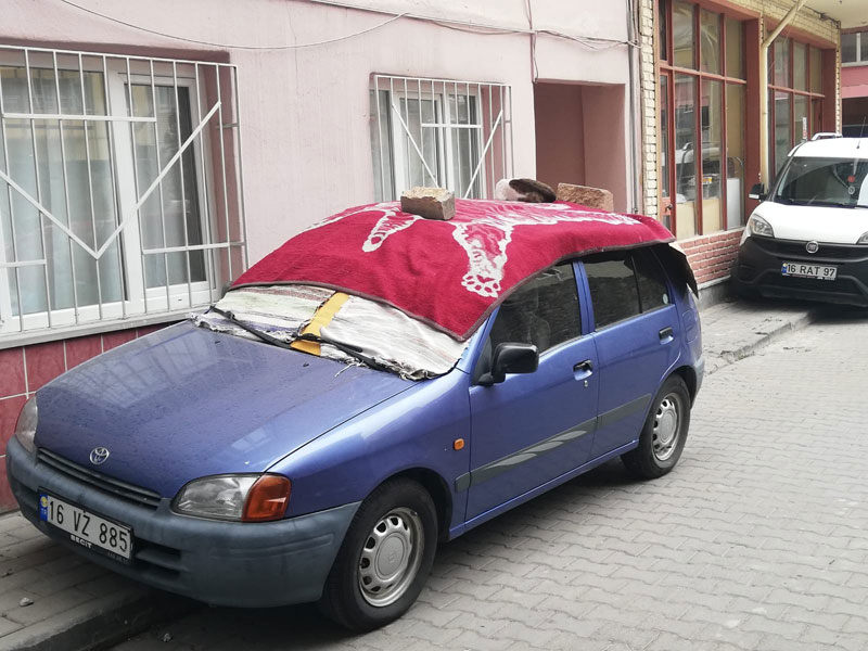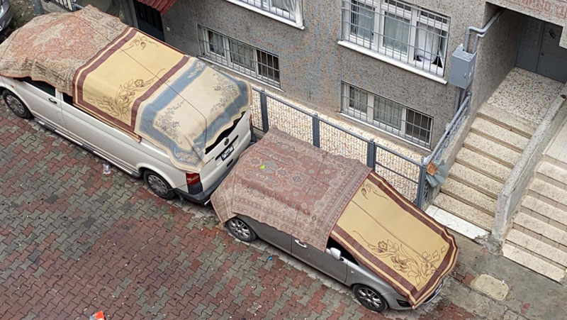 Bazı cadde ve sokaklarda üzeri renk renk battaniye ve halıyla örtülü araçların olması dikkat çekti.