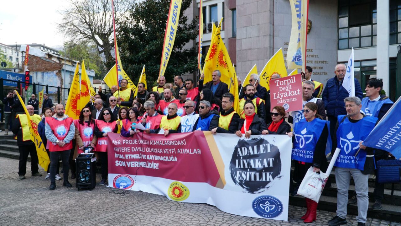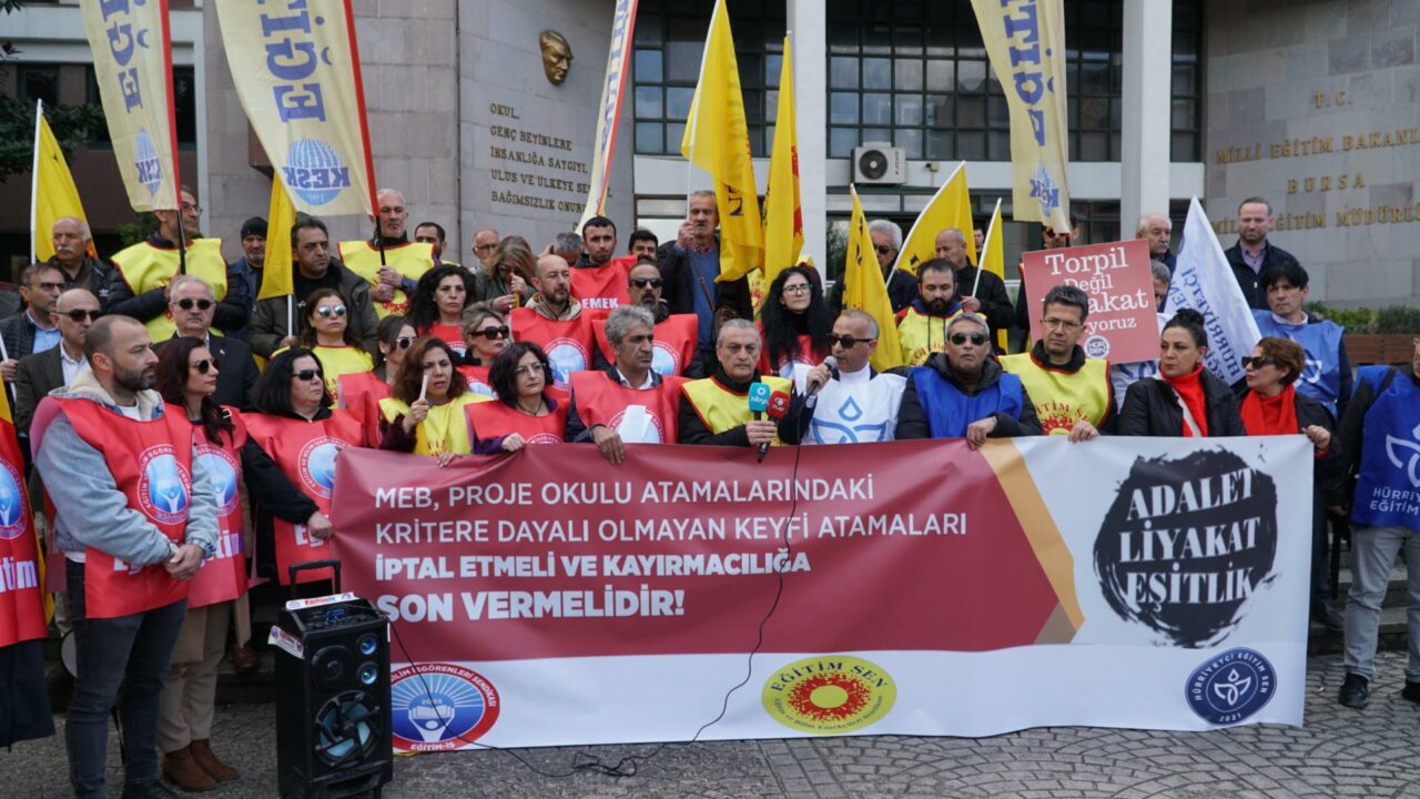 Bursa İl Milli Eğitim Müdürlüğü (MEM) önünde düzenlenen basın açıklamasında, atamalarda liyakatin hiçe sayıldığı, eğitim kurumlarının iktidarın siyasi kadrolaşma aracı haline geldiği öne sürüldü.