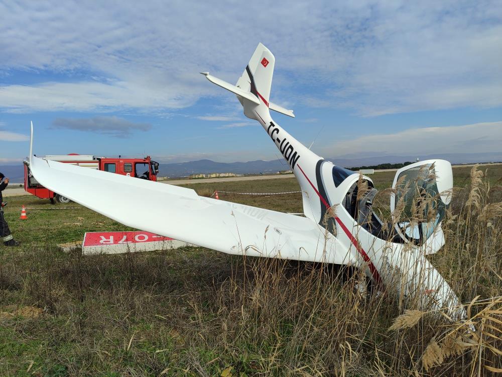Olay, saat 12.45 sıralarında Yenişehir Havaalanında meydana geldi. Özel uçuş okuluna ait eğitim uçağı, pisti terk ettiği esnada kaza kırıma uğradı.