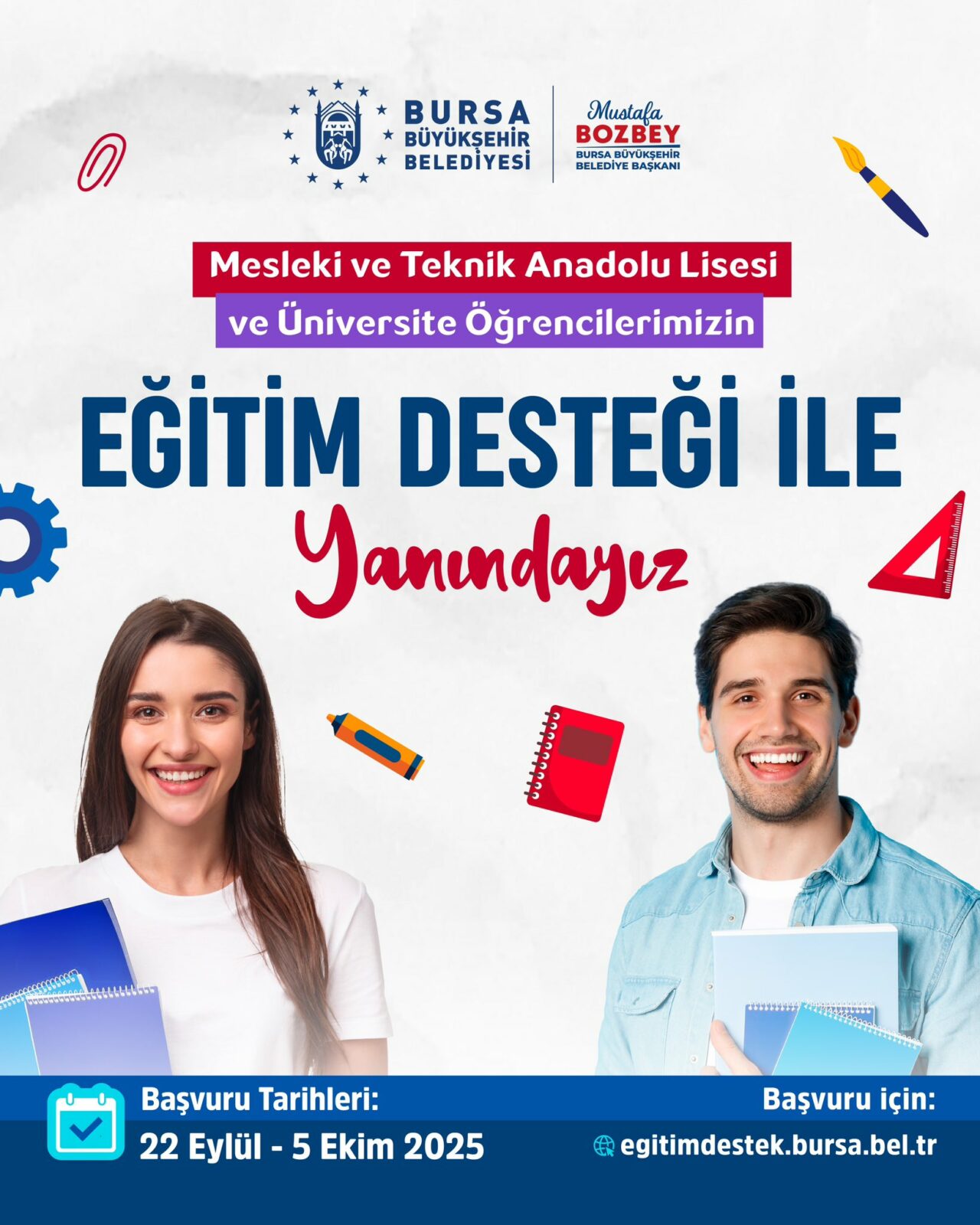 Başvurular 5 Ekim 2025 tarihine kadar yapılabilecek. Eğitim desteğinden faydalanmak isteyen öğrenciler, başvurularını egitimdestek.bursa.bel.tr adresi üzerinden gerçekleştirebilecek.