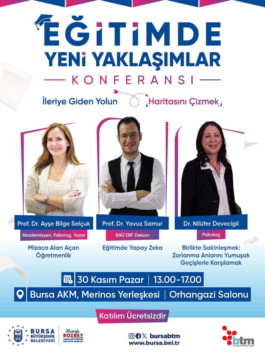 Bursa Büyükşehir Belediyesi, eğitim dünyasının gündemindeki yenilikçi yaklaşımları masaya yatırmak amacıyla dikkat çekici bir organizasyona hazırlanıyor. “Eğitimde Yeni Yaklaşımlar Konferansı”, 30 Kasım Pazar günü 13.00-17.00 saatleri arasında Bursa AKM Merinos Yerleşkesi Orhangazi Salonu’nda gerçekleştirilecek. Katılımın ücretsiz olduğu etkinlikte psikologlar ve akademisyenlerden oluşan güçlü bir konuşmacı kadrosu yer alacak.
