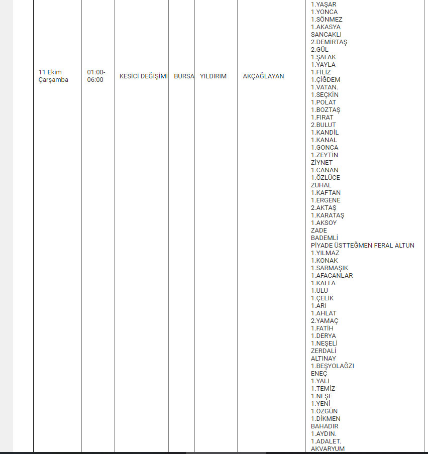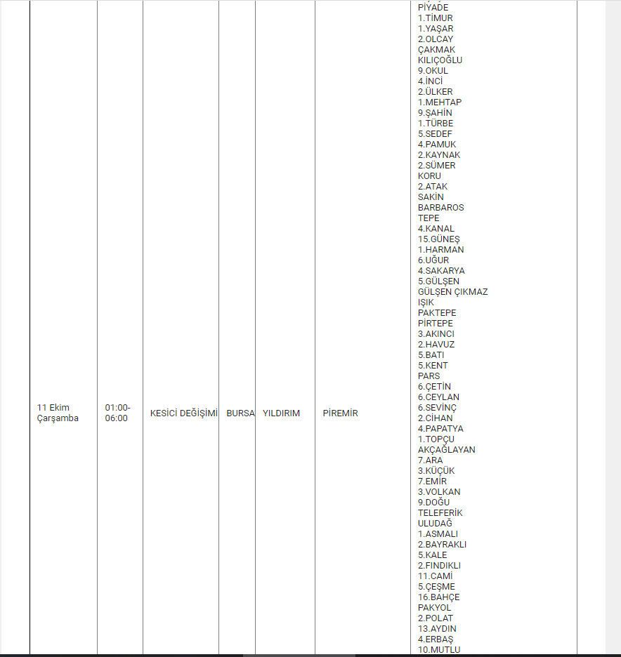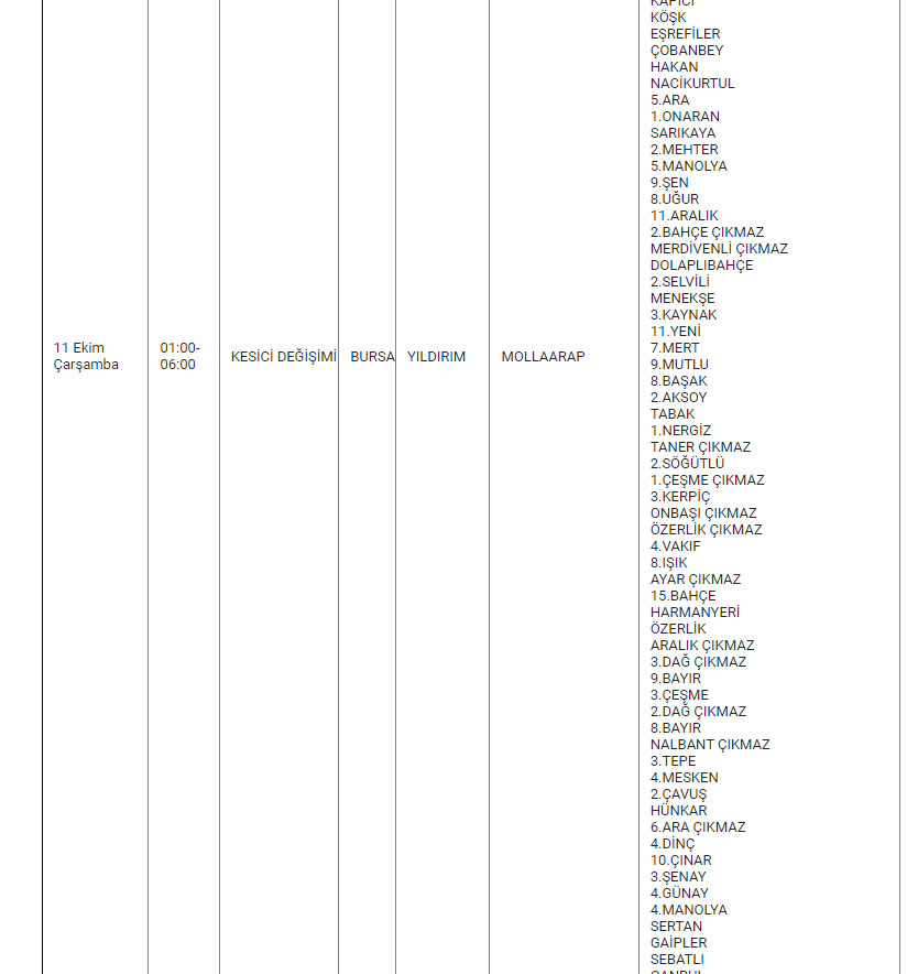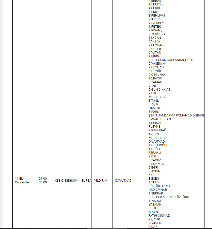 | 11 Ekim Çarşamba | 01:00-06:00 | KESİCİ DEĞİŞİMİ | BURSA | YILDIRIM | UMURBEY | BALABANCIK KAPICI KAPICI_1 ALKAN 6.PARK KULELİLER ÇOBANBEY 11.YAYLA ŞEHİT TOP.BNB.UFUK RODOPLU 9.ESEN 7.ENGİN MEHMETÇAVUŞ 6.EĞRİ HACIİSKENDER 6.HAMAM 8.UĞUR ABDULLAHEFENDİ FABRİKA |