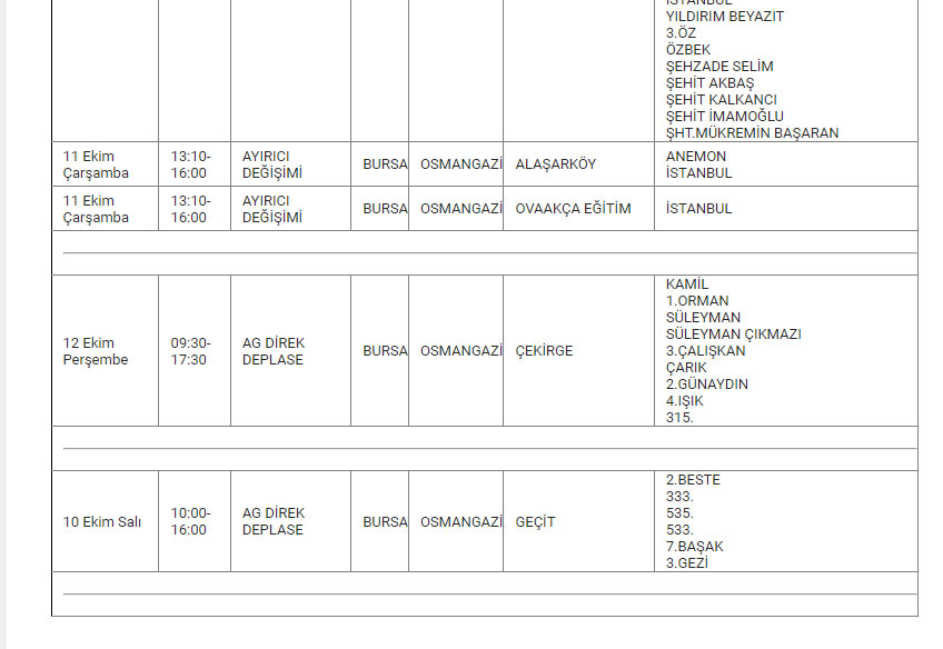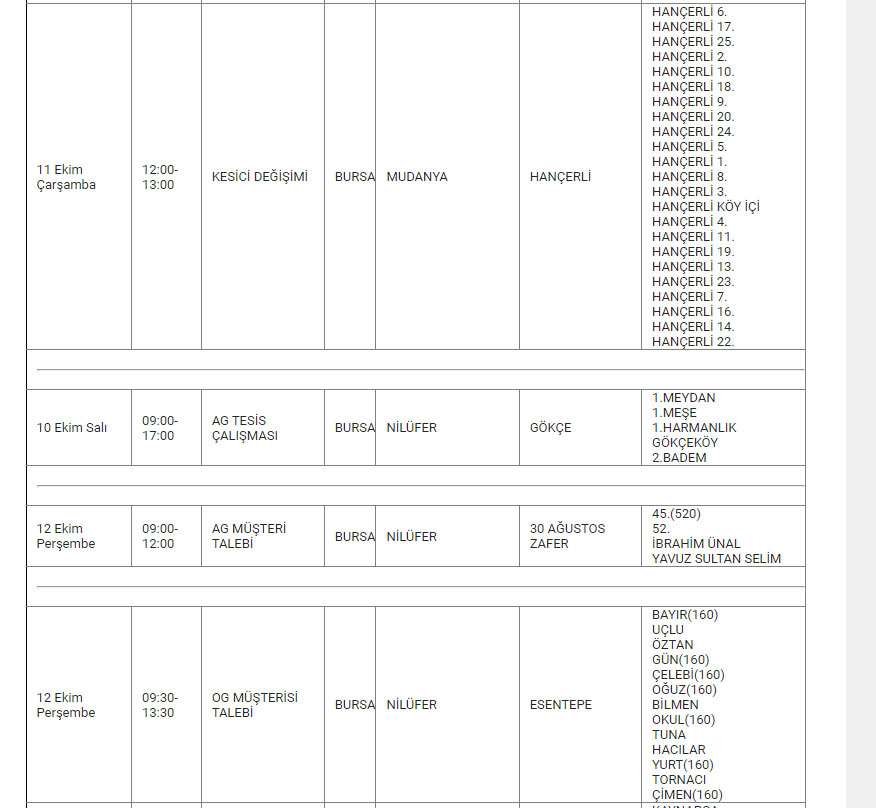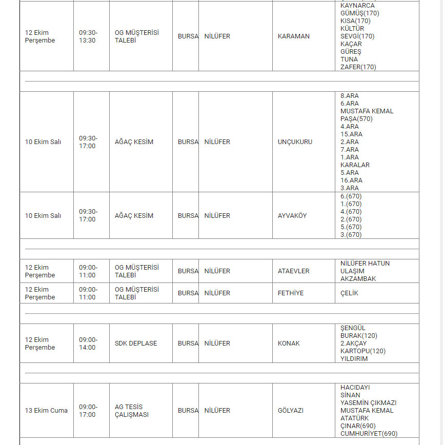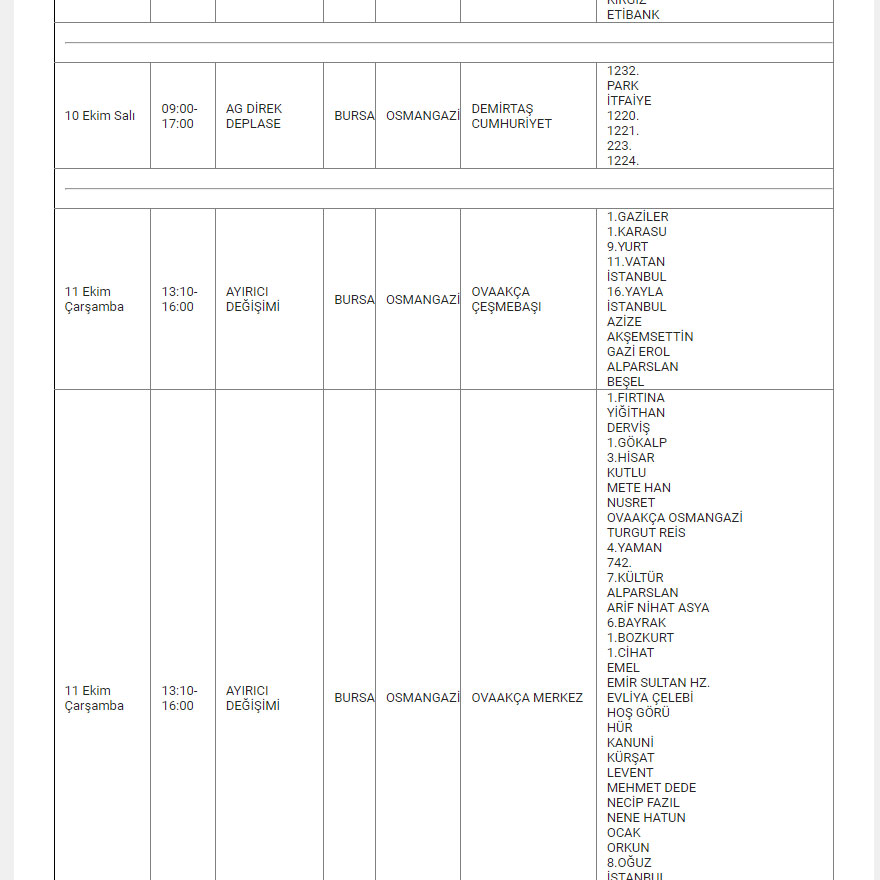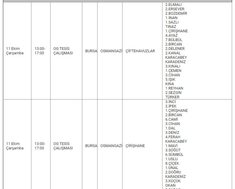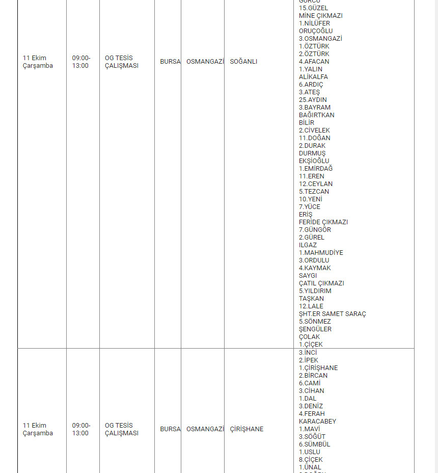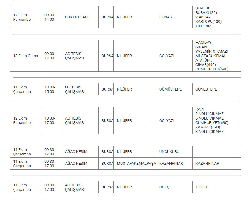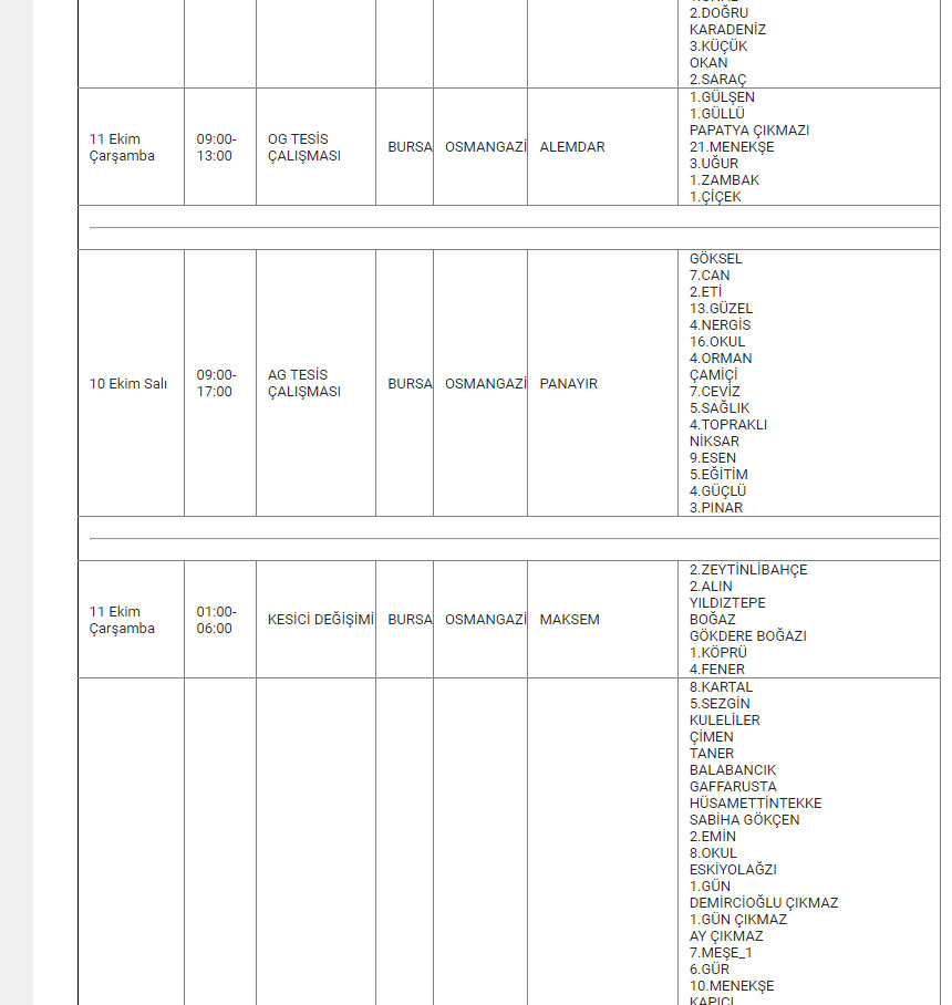 | 11 Ekim Çarşamba | 01:00-06:00 | KESİCİ DEĞİŞİMİ | BURSA | OSMANGAZİ | MAKSEM | 2.ZEYTİNLİBAHÇE 2.ALIN YILDIZTEPE BOĞAZ GÖKDERE BOĞAZI 1.KÖPRÜ 4.FENER |