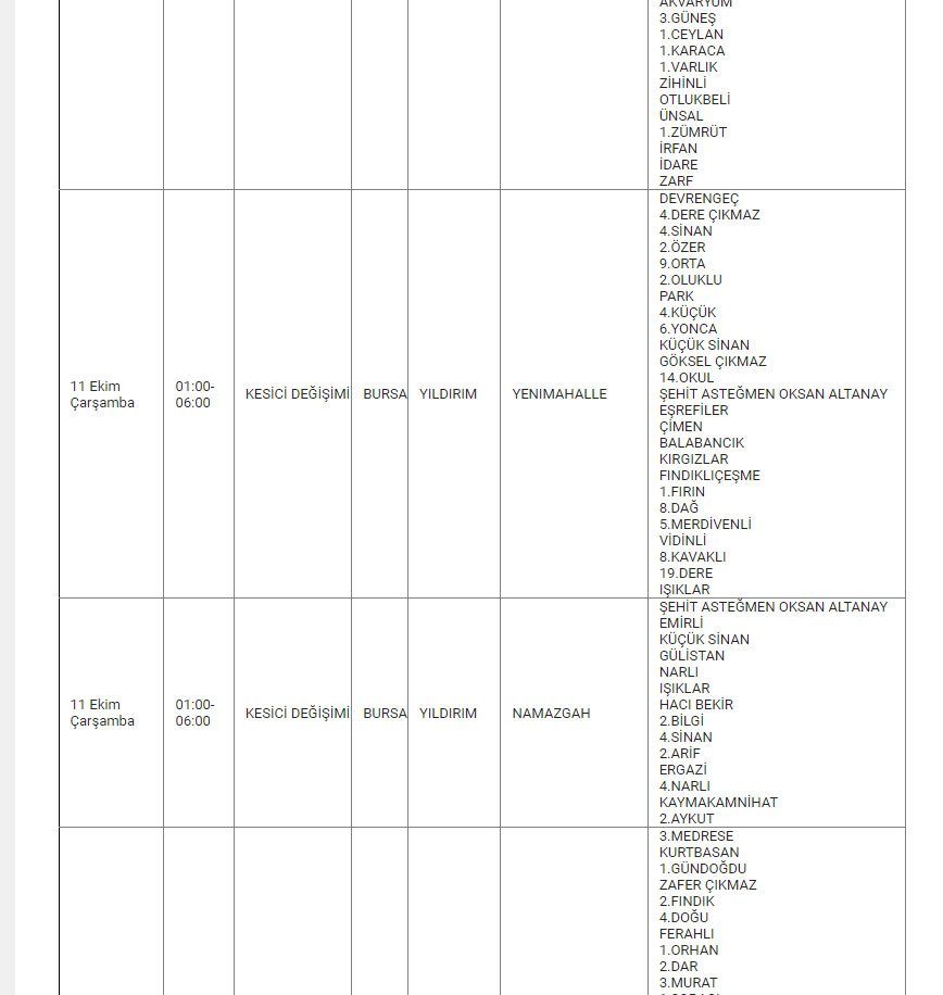 | 11 Ekim Çarşamba | 01:00-06:00 | KESİCİ DEĞİŞİMİ | BURSA | YILDIRIM | NAMAZGAH | ŞEHİT ASTEĞMEN OKSAN ALTANAY EMİRLİ KÜÇÜK SİNAN GÜLİSTAN NARLI IŞIKLAR HACI BEKİR 2.BİLGİ 4.SİNAN 2.ARİF ERGAZİ 4.NARLI KAYMAKAMNİHAT 2.AYKUT |