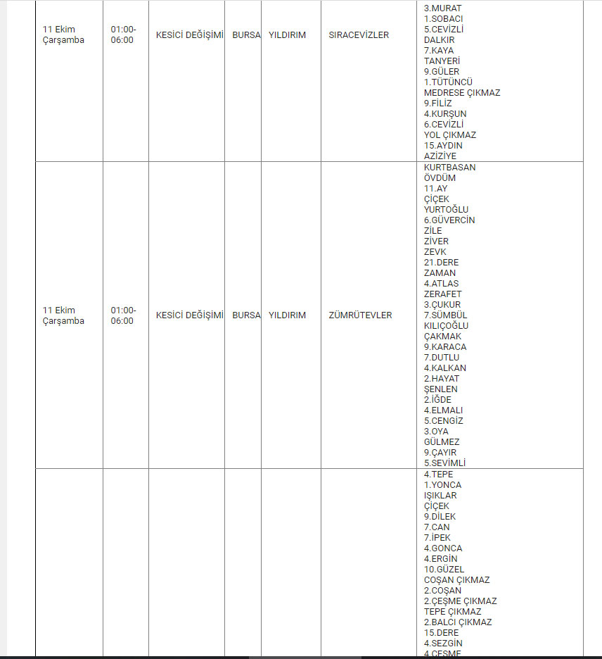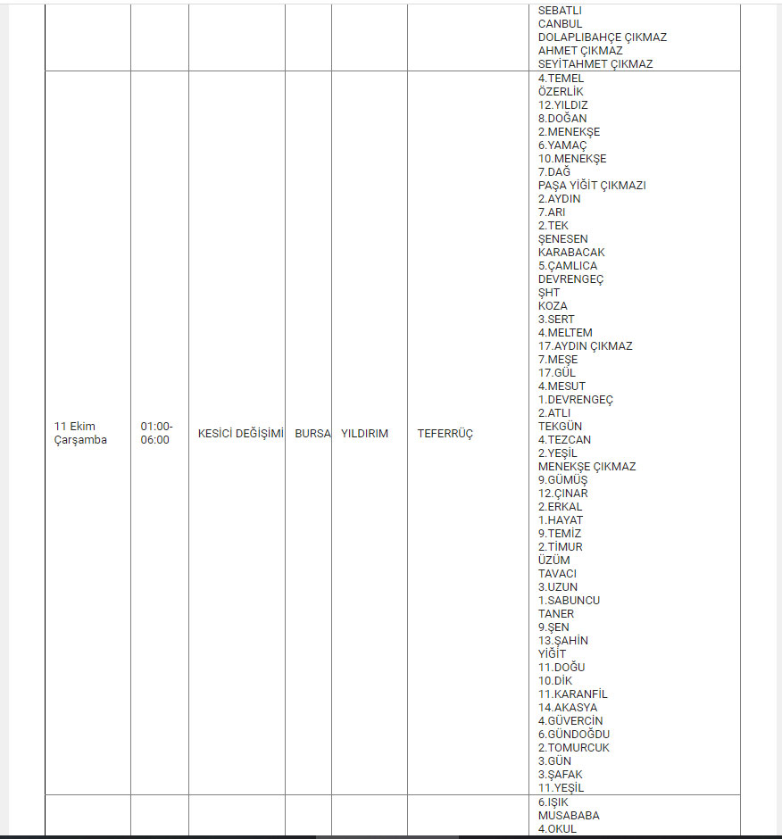 | 11 Ekim Çarşamba | 01:00-06:00 | KESİCİ DEĞİŞİMİ | BURSA | YILDIRIM | SIRACEVİZLER | 3.MEDRESE KURTBASAN 1.GÜNDOĞDU ZAFER ÇIKMAZ 2.FINDIK 4.DOĞU FERAHLI 1.ORHAN 2.DAR 3.MURAT 1.SOBACI 5.CEVİZLİ DALKIR 7.KAYA TANYERİ 9.GÜLER 1.TÜTÜNCÜ MEDRESE ÇIKMAZ 9.FİLİZ 4.KURŞUN 6.CEVİZLİ YOL ÇIKMAZ 15.AYDIN AZİZİYE |