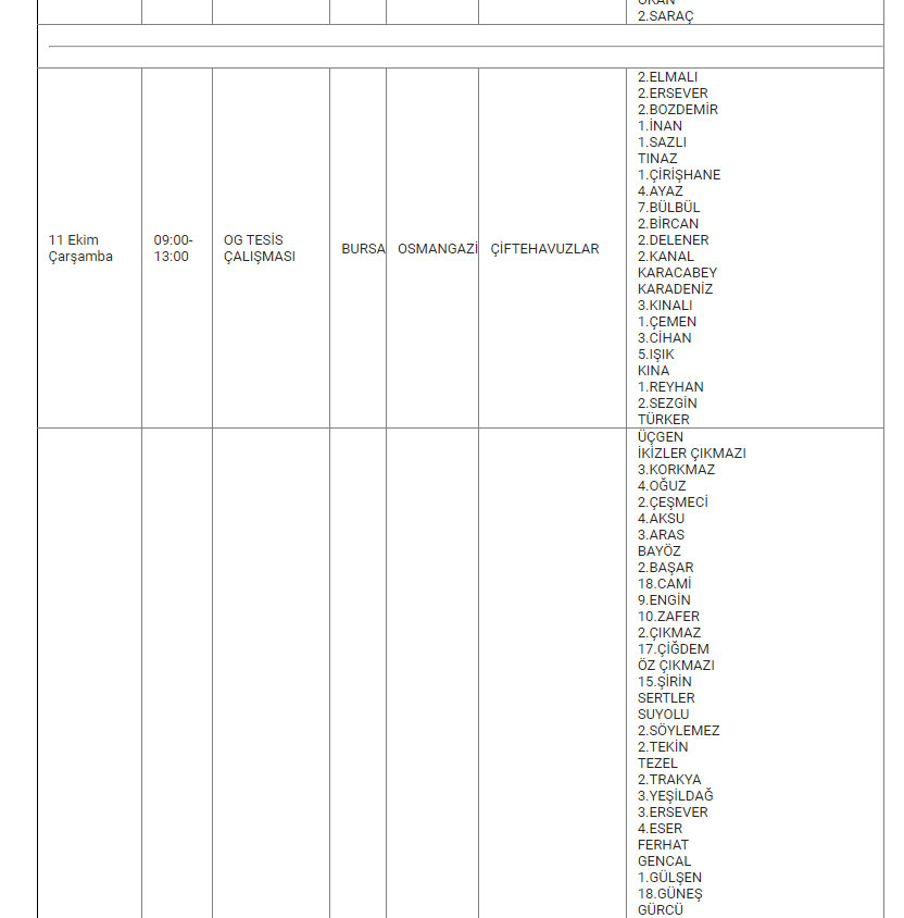 | 11 Ekim Çarşamba | 09:00-17:00 | AG TESİS ÇALIŞMASI | BURSA | YILDIRIM | HACİVAT | A354. A352. A351. A353. 364. 363. 358. 359 355 356 355/1 A350. 11 EYLÜL |