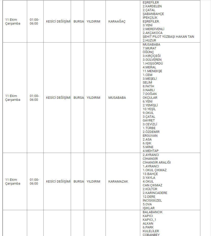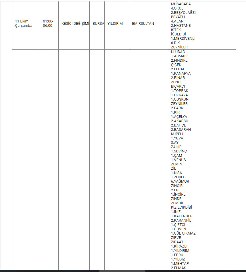 | 11 Ekim Çarşamba | 01:00-06:00 | KESİCİ DEĞİŞİMİ | BURSA | YILDIRIM | EMİRSULTAN | 6.IŞIK MUSABABA 4.OKUL 2.BEŞYOLAĞZI BEYATLI 4.ALAN 2.HASTANE İSTEK İĞDEDİBİ 1.MERDİVENLİ 6.DİK ZEYNİLER |
