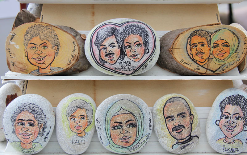 Parka gelenlerin karikatür portrelerini 2-3 dakikada oldukça benzer bir şekilde kağıda ya da taşa çizebilen Akkoç, yumurtaya, tabağa, ahşaba ve su kabağına da çizim yapıyor.