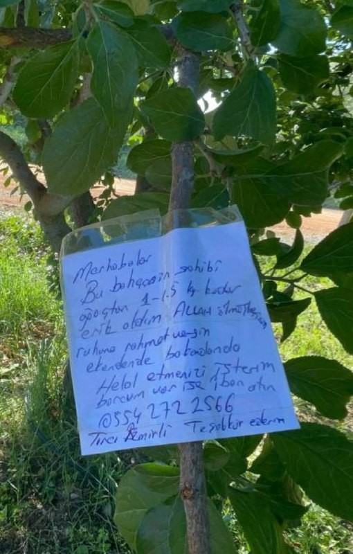 Notun üzerinde, “Merhabalar bu bahçenin sahibi. Ağaçtan 1-1,5 kilo erik aldım. Allah ölmüşlerinizin ruhuna rahmet versin. Ekenin de bakanın da helal etmesini isterim. Borcum var ise iban atın. Tır’cı İzmirli. Teşekkür ederim” yazılı not tarla sahibini hayrete düşürdü.