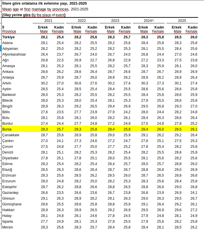 Yıllara göre ortalama ilk evlenme yaşı incelendiğinde, her iki cinsiyette de ilk evlenme yaşının arttığı görüldü. Ortalama ilk evlenme yaşı 2025 yılında erkeklerde 28,5 iken kadınlarda 26,0 oldu. Erkek ile kadın arasındaki ortalama ilk evlenme yaş farkı ise 2,5 yaş olarak gerçekleşti.