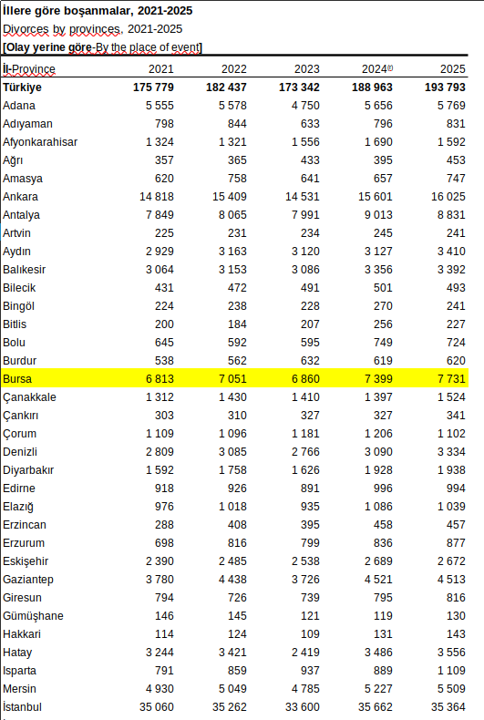 Bursa’da 2025 yılında boşanan çift sayısı ise 7 bin 731. Kaba boşanma hızı ise yüzde 2,38… 2024 yılında Bursa’da 7 bin 399 çift boşanmış, kaba boşanma hızı da 2,29 olarak belirlenmişti.