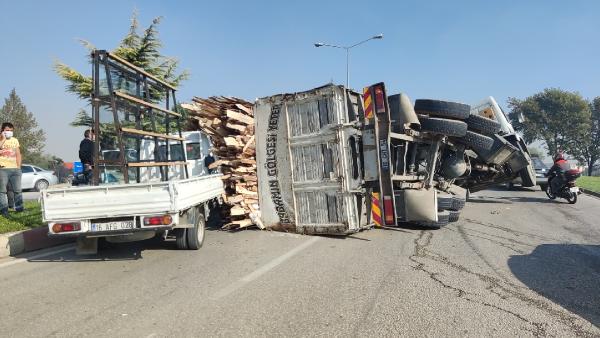 Bursa’dan gelen ve köprülü kavşaktan dönüş yapan İlyas Aktaş (57) yönetimindeki 16 CHT 54 plakalı ağaç yüklü kamyon, kontrolden çıkarak, yanında giden Ferhat Demir’in (35) kullandığı 16 AFG 028 plakalı kamyonetin üzerine devrildi. Kaza sırasında sürücü Demir, kamyonetten son anda inmesi sonucu yaralanmadı. Kazada kamyon sürücüsü Aktaş da yaralanmazken, ulaşımda bir süre aksama oldu.
