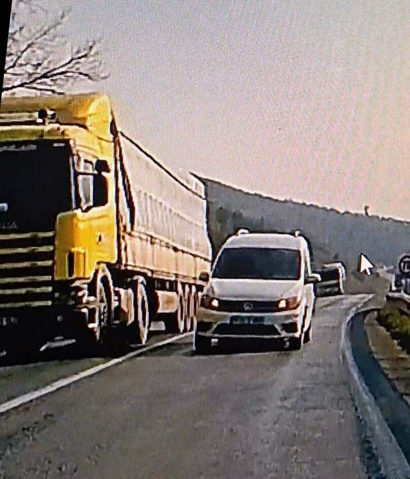 İnegöl ilçesinden Yenişehir yönüne tek şeritli yolda ilerleyen 16 BCE 886 plakalı hafif ticari aracın sürücüsü, önündeki TIR’ı sollamak için ters şerit değiştirdi. O sırada karşı yönden gelen 16 LKA 16 plakalı otomobilin sürücüsü Yaşar B., panikle fren yapıp, direksiyonu sağa kırıp, kazayı önledi. O anlar otomobilin araç kamerasına yansıdı. (DHA)