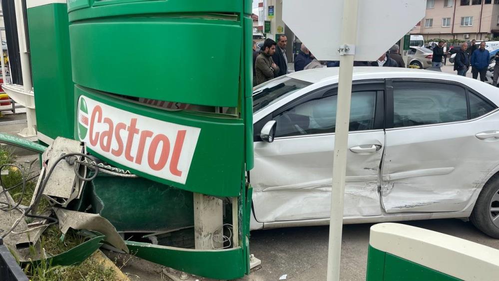 Çarpışmanın etkisi ile akaryakıt istasyonuna giren otomobil sürücüsü şans eseri pompa istasyonlarını ıskalayıp tabelaya vurarak durabildi.