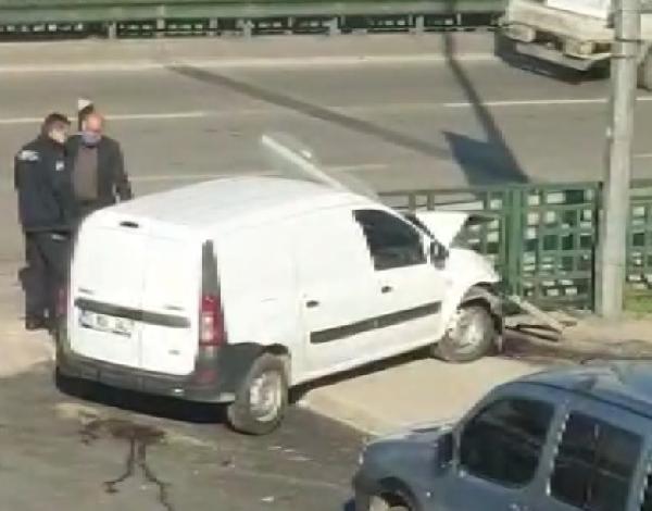 Sürücüsü öğrenilemeyen hafif ticari araç, kontrolden çıkıp önce bir iş yerinin bahçe duvarına, ardından da köprü demirlerine çarparak, durabildi.