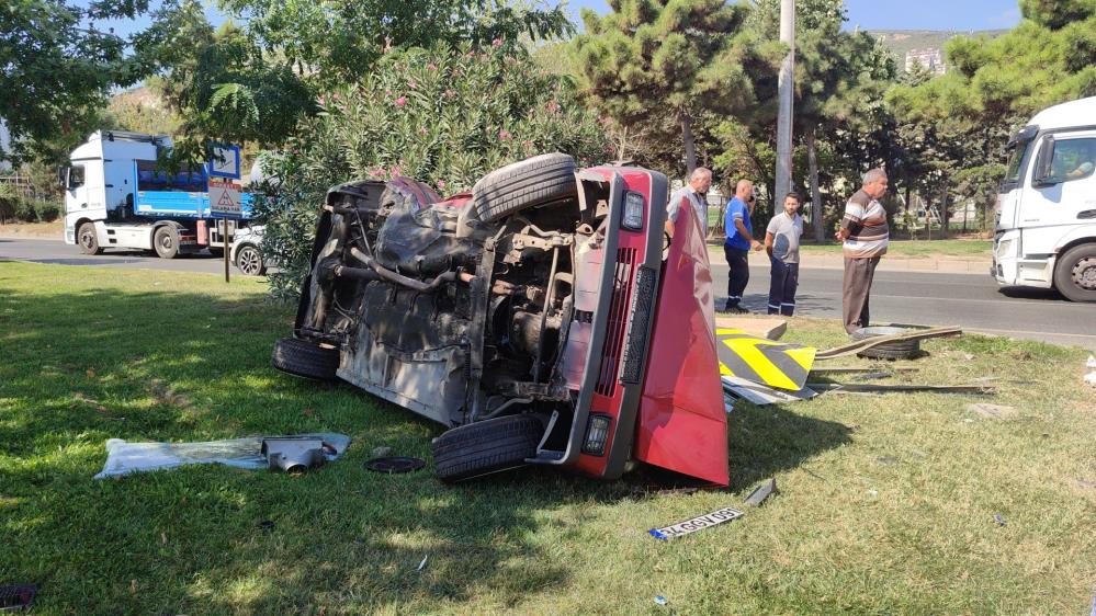 Savrulan otomobil takla atarak refüjde bulunan tabelalara çarptıktan sonra ters döndü.