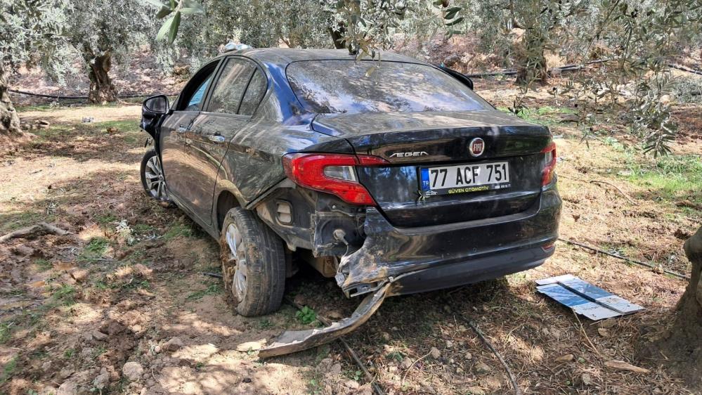Yol kenarlarındaki zeytin ağaçlarının bulunduğu tarlaya uçan otomobil, kullanılmaz hale geldi.