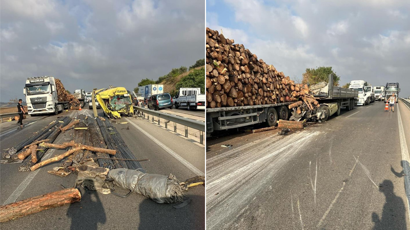 Sürücüsü ve plakası öğrenilemeyen bir TIR, henüz bilinmeyen bir sebepten dolayı önünde seyreden tomruk yüklü başka bir TIR’a çarptı.