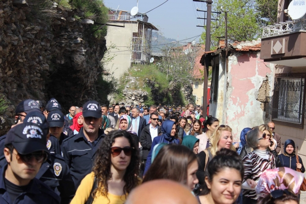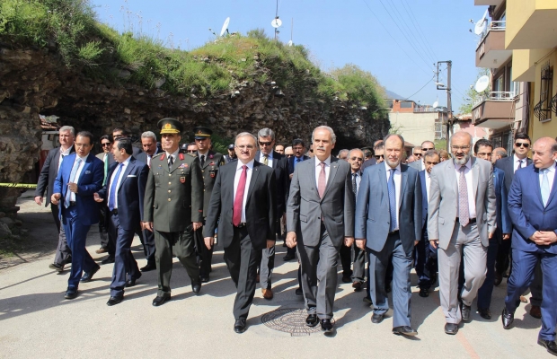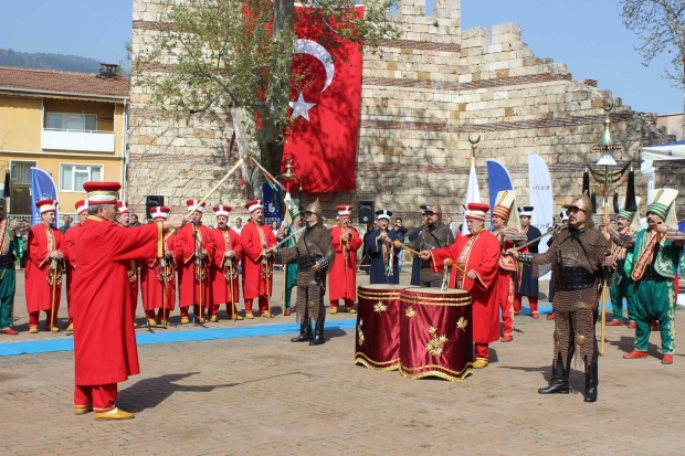 Pınarbaşı’ndaki kutlamanın ardından tören Tophane’de devam etti. Kortej yürüyüşü ile gelinen Tophane Şehitliği’nde önce Osman Gazi ve Orhan Gazi’nin türbeleri ziyaret edilip dualar edildi.