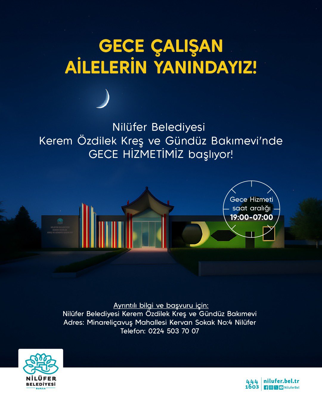 Nilüfer Belediyesi, gece vardiyasında çalışan ebeveynlerin çocuk bakımında yaşadığı zorluklara çözüm olacak önemli bir uygulamayı hayata geçiriyor. Kerem Özdilek Kreş ve Gündüz Bakımevi’nde gece hizmeti başlıyor.
