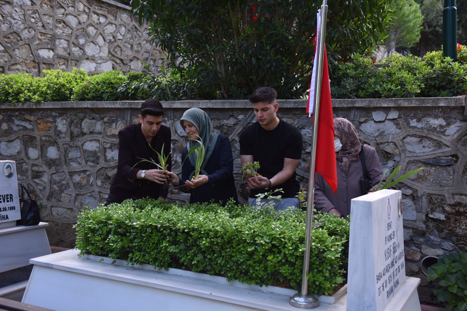Şehit aileleri ile birlikte Pınarbaşı Garnizon Şehitliği’ni ziyaret eden gençler, milletin bekası, devletin devamı için kendi hayatlarını hiçe sayarak şehadete ulaşan şehitler için Kur’an-ı Kerim okudu.