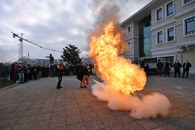 Gerçeğini aratmayan tatbikatta, belediye personeline yangın söndürme tüpleri ile yangına müdahalenin nasıl gerçekleştirileceği konusunda da uygulamalı eğitim verildi. Boş bir alanda yakılan ateş ilk önce sivil savunma ekipleri tarafından, daha sonra da belediye çalışanları tarafından uygulamalı olarak söndürüldü. Tatbikat sırasında personele, büyük ve küçük çaplı yangın durumunda ne yapılması gerektiği uygulamalı olarak anlatıldı. Yangın çeşitleri, söndürme teknikleri ve söndürücüler hakkında bilgi sahibi olan personel, yangın söndürme tüplerini sırayla kullanarak uygulama yaptı.