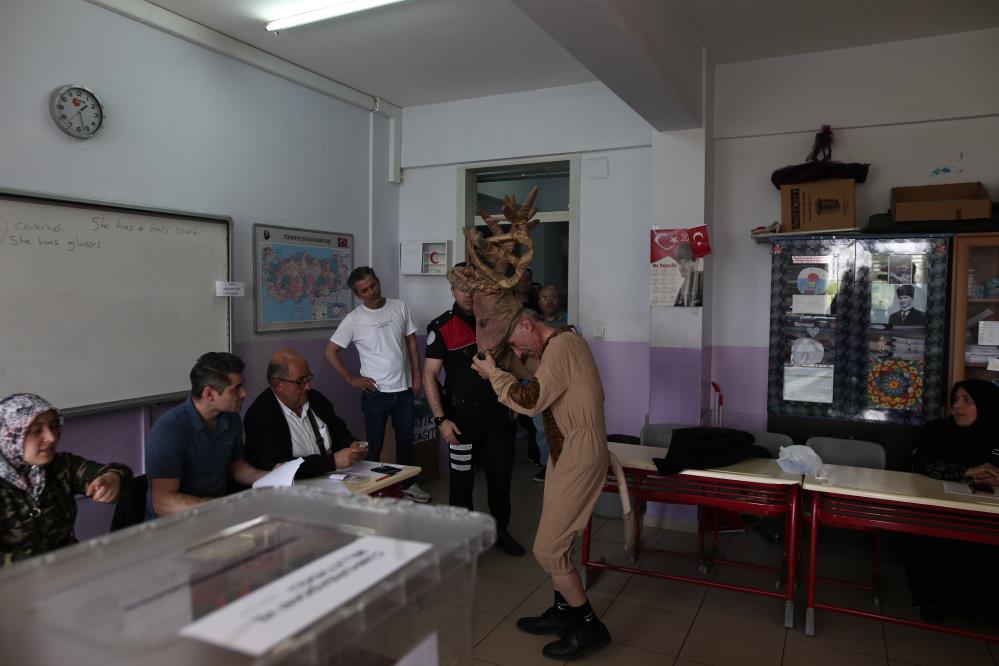 Türkiye’nin farklı illerinde çeşitli kostümlerle oy kullanmaya gidenler renkli görüntüler oluşturdu. Bursa’da da tiyatrocu Bahtiyar Keskin, giydiği geyik kostümüyle siyaset geyiğine son noktayı koydu. Boynuzlu başlığı ile okulun bahçesine girdiği andan itibaren vatandaşların ve çocukların ilgisini çeken geyik kostümlü Keskin, çocuklarla bol bol fotoğraf çekindi. Kostümünden ötürü, uzun süre kontrol için dışarıda beklemek zorunda kalan Keskin, daha sonra kafasındaki boynuzlu başlığı çıkarıp oyunu kullandı.