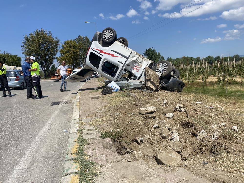 Çarpmanın etkisiyle takla atan hafif ticari araç, ters döndü. Kazada, sürücü ile araçta bulunan 3 kişi yaralandı.