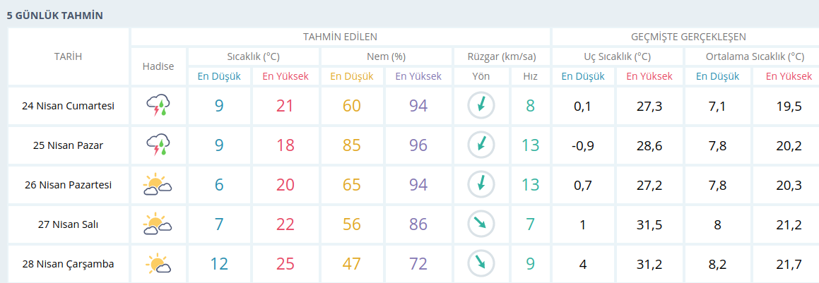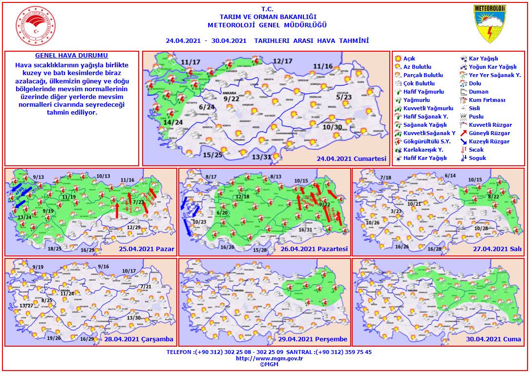 Haftalık Hava Durumu (24 – 30 Nisan 2021) Hava sıcaklıklarının yağışla birlikte kuzey ve batı kesimlerde biraz azalacağı, ülkemizin güney ve doğu bölgelerinde mevsim normalleri üzerinde, diğer yerlerde mevsim normalleri civarında seyredeceği tahmin ediliyor.