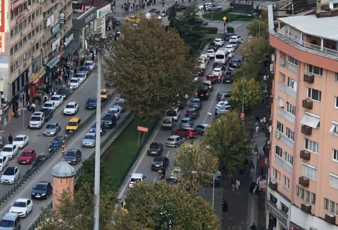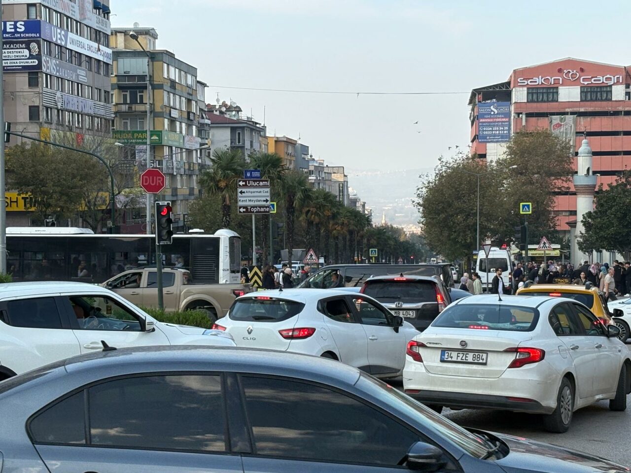 Kent merkezinin en işlek noktalarından Atatürk Caddesi, bugün deyim yerindeyse durdu. Heykel’den Setbaşı yönüne ilerleyen araçlar uzun kuyruklar oluşturdu. Özellikle kavşak noktalarında ilerleme neredeyse imkansız hale geldi.