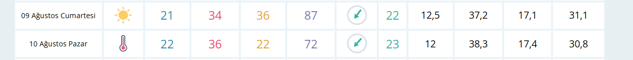 9 Ağustos cuma günü en yüksek sıcaklık 34 derece, akşam ise en düşük sıcaklık 21 derece olacak. Hava ise açık gözüküyor…