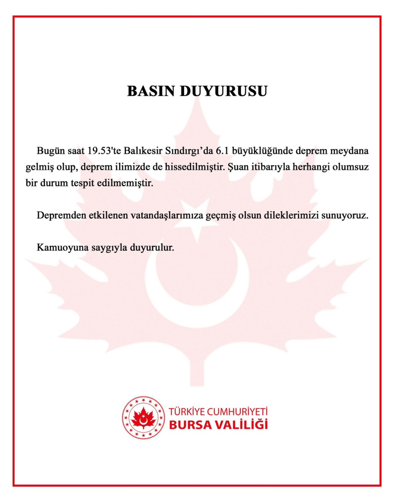 Ana Sayfa › Bursa › Bursa’da hasar var mı? İşte Valilikten açıklamaBursa’da hasar var mı? İşte Valilikten açıklama Bursa Valiliği, deprem sonrası yapılan saha incelemesinde Bursa’da herhangi olumsuz bir durumun bulunmadığını açıkladı. Giriş: 10-08-2025 20:38Güncelleme: 10-08-2025 22:04Kaynak: HABER MERKEZİ Bursa ABONE OL + - Valilikten yapılan açıklama şöyle: HABERİ PAYLAŞ