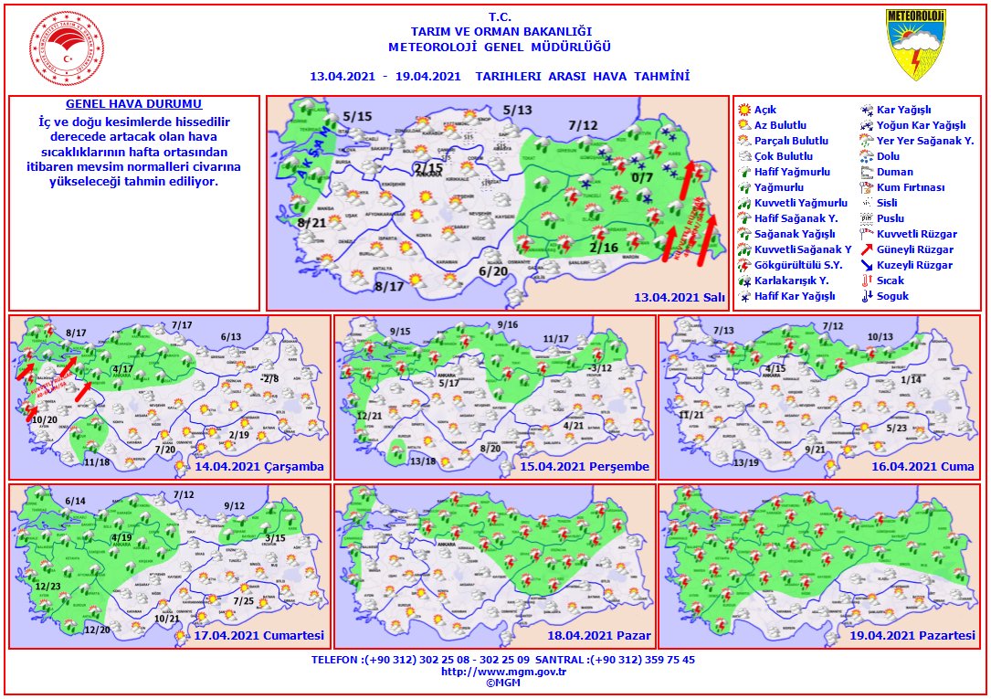 Haftalık Hava Durumu (13 – 19 Nisan 2021) İç ve doğu kesimlerde hissedilir derecede aratacak olan hava sıcaklıklarının hafta ortasından itibaren mevsim normalleri civarına yükseleceği tahmin ediliyor.