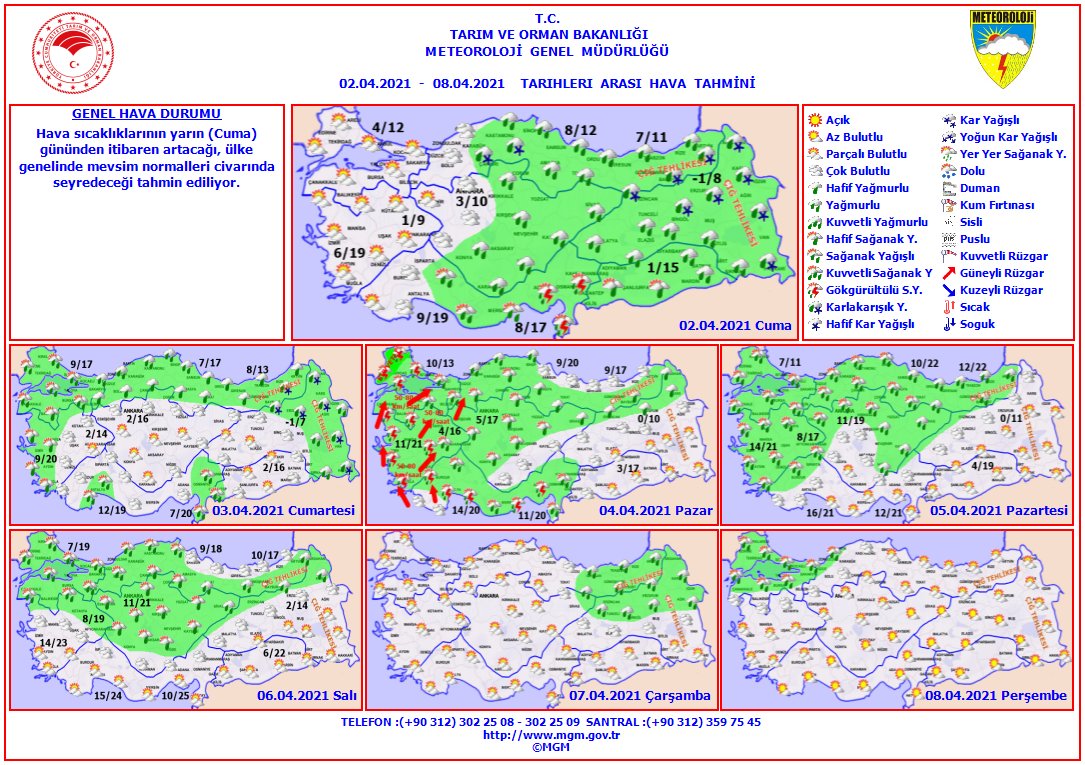 Haftalık Hava Durumu (2 – 8 Nisan 2021) Hava sıcaklıklarının yarından (Cuma) itibaren artacağı, Ülkemiz genelinde mevsim normalleri civarında seyredeceği tahmin ediliyor.