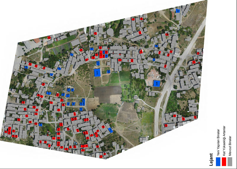 Tespit edilen bu kat artışları harita üzerinde işaretlenerek yapının ruhsatlı mı yoksa kaçak mı olduğunun tespit edilmesi için konu fotoğraflarla ilgili ilçe belediyelerine aktarıldı.