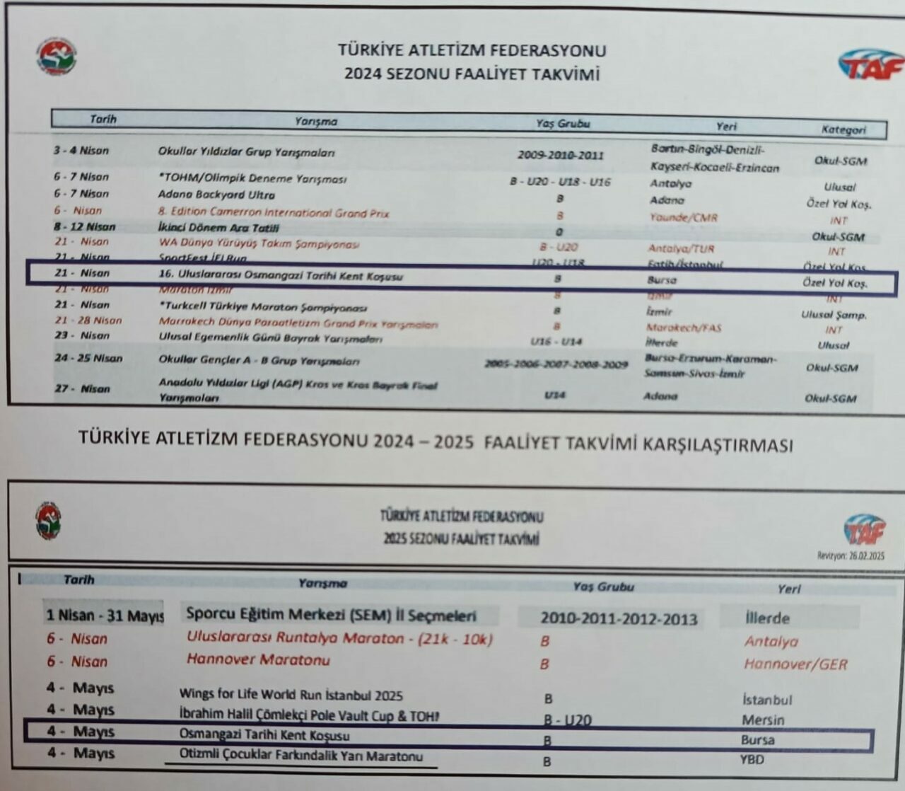 Uluslararası Osmangazi Tarihi Kent Koşusu’nun 35 yıl önce koşulan ve tarih olan Yeşil Bursa Yarı Maratonu gibi silinip gitmesinden endişe eden 35 yıllık maratoncu aynı zamanda Bursa sevdalısı rekortmen 79 yaşındaki milli atlet Ali Turan, “Valilik makamına verdiğim dilekçe de böyle bir uluslararası organizasyonun yapılmaması halinde bir daha yapılmasının mümkün olamayacağını ifade ettim. Türkiye Atletizm Federasyonu, 2024 yılında bu koşuyu 21 Nisan’da planlarken, 2025 yılında maalesef ’geleneksel’ tarihi değiştirerek 4 Mayıs’a ve ’Uluslararası’ ibaresini kaldırarak almıştır. Uluslararası Osman Gazi Tarihi Kent Koşusu’nun geleneksel niteliğinin korunması ve devamının sağlanması için Nisan ayı içindeki ikinci veya üçüncü pazar gününe alınması gerektiğini, organizasyonun yapılmaması halinde bir daha yapılması mümkün olamayacak. Koşunun asıl tarihinde yapılması için Osmangazi Belediyesi’nde yarıştan sorumlu başkan yardımcısı ile görüştüm. Pazar günleri Bursa’da sınavların olması sebebiyle yarış takviminin mayıs ayına ertelendiği cevabını aldım” dedi.