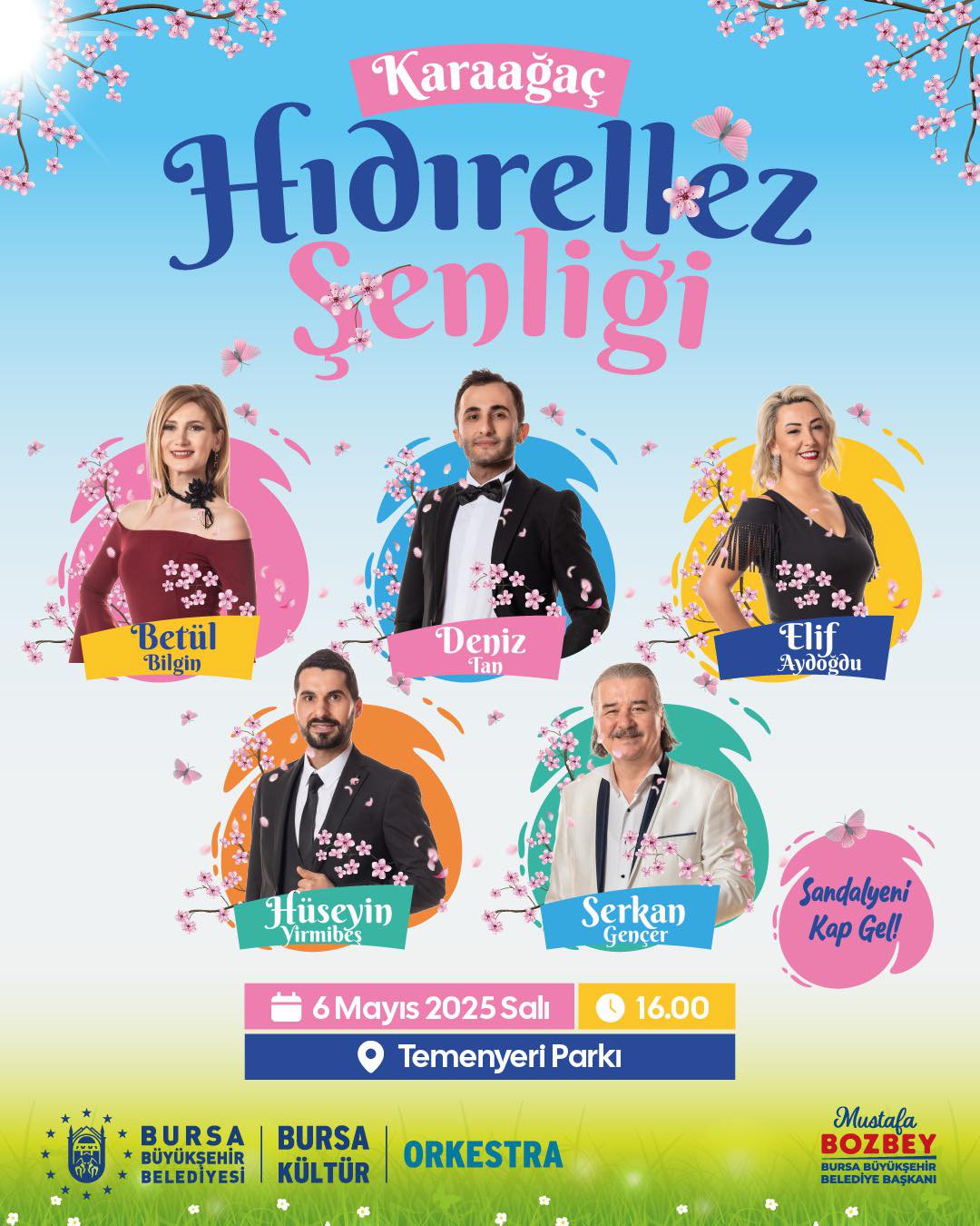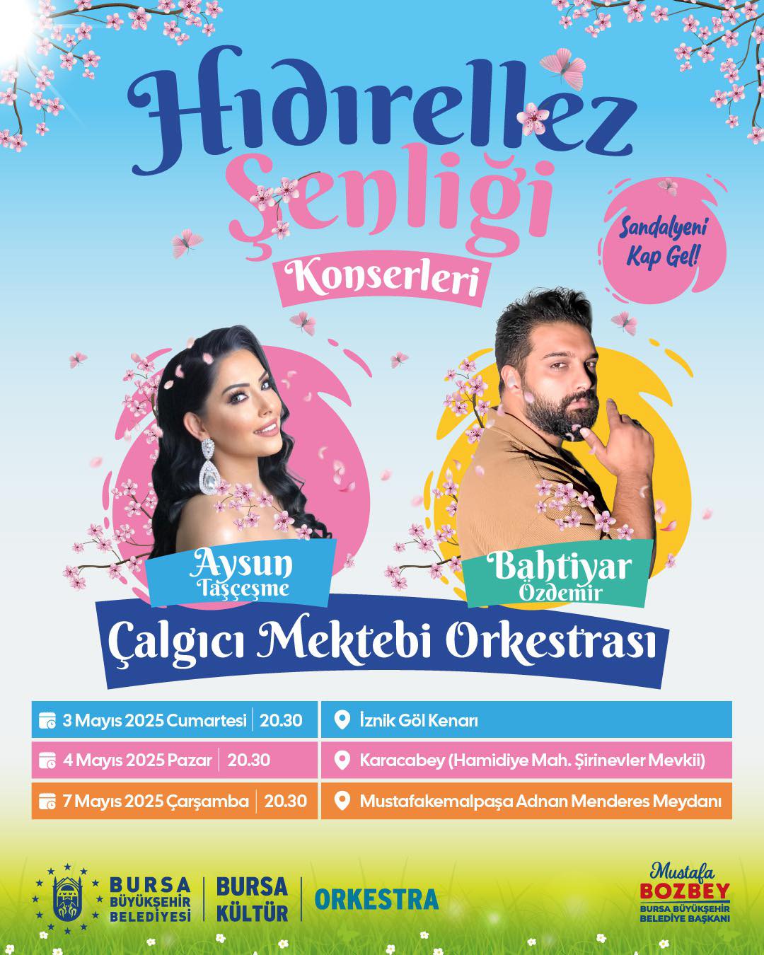 Bursa Büyükşehir Belediyesi, baharın müjdecisi, bolluk ve bereketin sembolü olan Hıdırellez kutlamalarını 3-7 Mayıs tarihleri arasında kentin farklı noktalarında düzenliyor. ‘Hıdırellez Şenliği’ kapsamında Aysun Taşçeşme ve Bahtiyar Özdemir, Çalgıcı Mektebi Orkestrası eşliğinde İznik, Karacabey ve Mustafakemalpaşa’da sahne alarak Hıdırellez’in coşkusunu vatandaşlara yaşatacak. Temenyeri Parkı’nda düzenlenen programda ise Orkestra Şube Müdürlüğü sanatçıları Betül Bilgin, Deniz Tan, Elif Aydoğdu, Hüseyin Yirmibeş ve Serkan Gençer sahne alarak şarkılarını Bursalılar için söyleyecek.