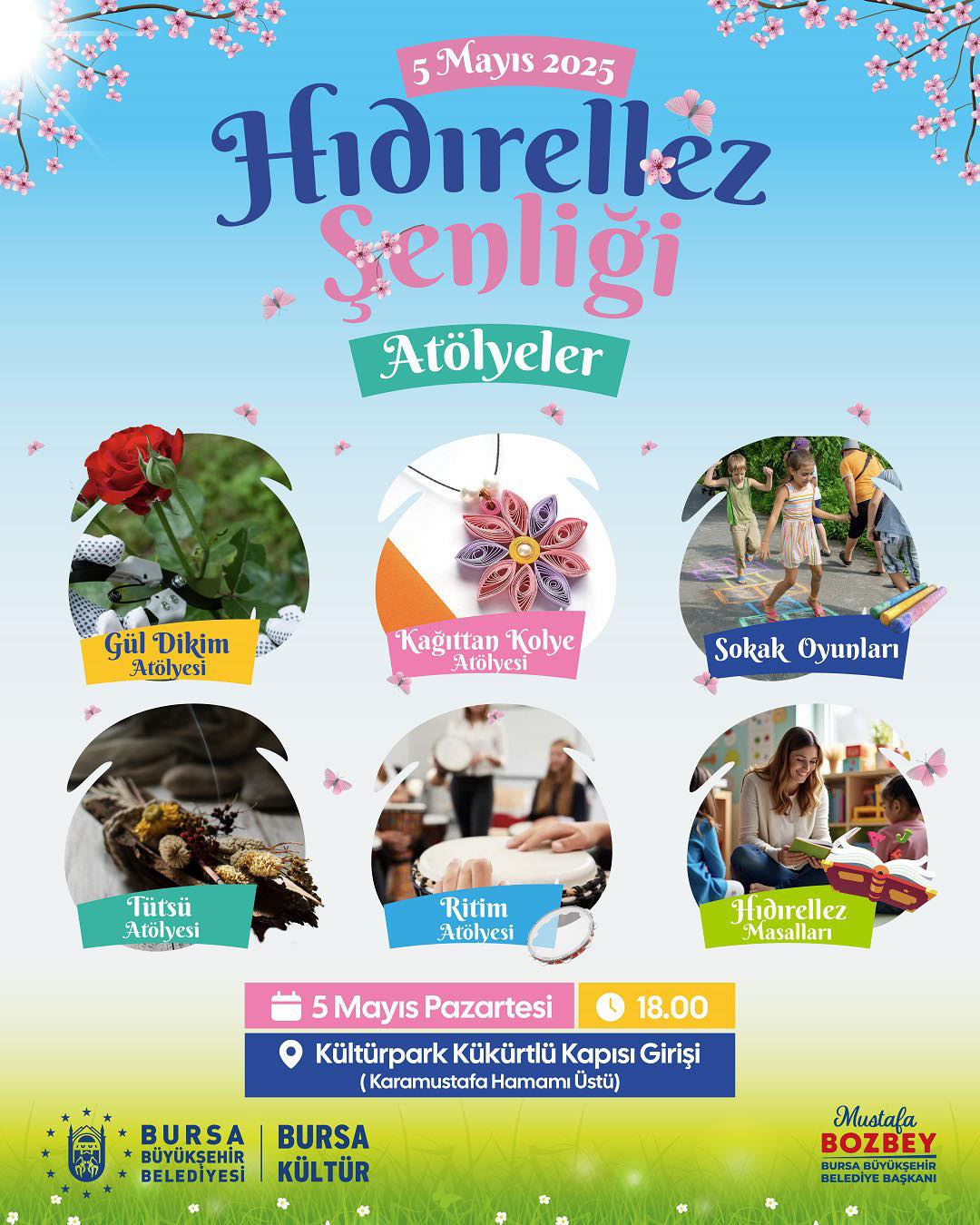 5 Mayıs Pazartesi günü ise saat 18.00’da Atatürk Stadyumu Kütüphanesi önünden Kültürpark Kükürtlü Kapısı’na kadar sürecek olan kortej yürüyüşüyle etkinlikler başlayacak. Gül dikim, kağıttan kolye, tütsü ve ritim atölyelerinin yapılacağı programda, sokak oyunları ve Hıdırellez masallarıyla yediden yetmişe herkes eğlenceli vakit geçirecek. Kostüm yarışmasının da yapılacağı şenlikte, katılanları birbirinden sürpriz hediyeler bekliyor. Aysun Taşçeşme ve Bahtiyar Özdemir ile Çalgıcı Mektebi Orkestrası’nın da sahne alacağı programda, klarnet ustası Hüsnü Şenlendirici de Bursalılar için konser verecek.