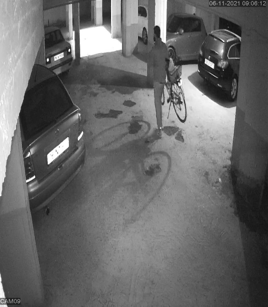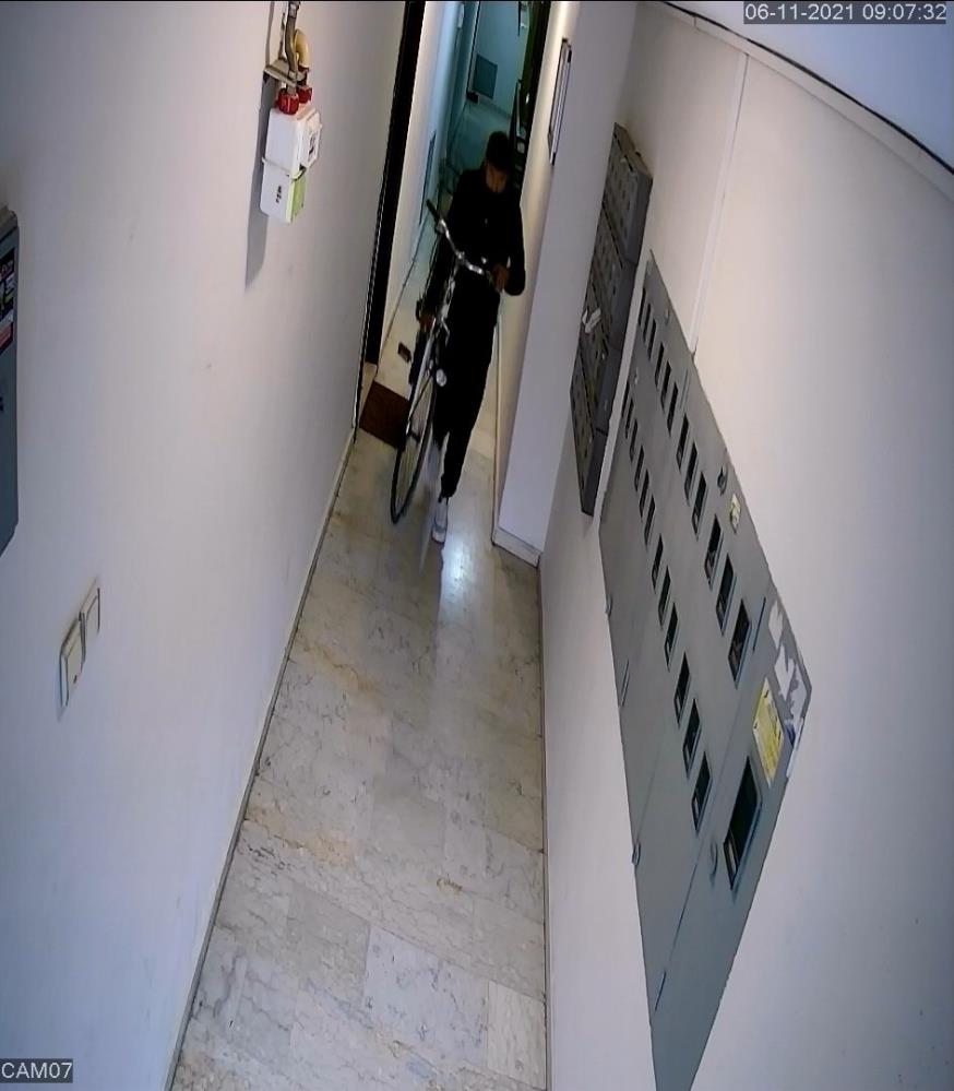 Güvenlik kamerası görüntülerinde bisikletin kilidini keserek çalan hırsız, otoparkta bir süre çıkış kapısını aramak için dolaştı. Apartman sakinlerinin binadan çıkmasını bekleyen hırsız, bisikleti alarak elini kolunu sallayarak apartmanın giriş kapısından kaçtı. O esnada yoldan geçenlere ve diğer bloktan çıkan sakinlere aldırış etmeyen pişkin hırsız, bisiklete binerek olay yerinden uzaklaştı.