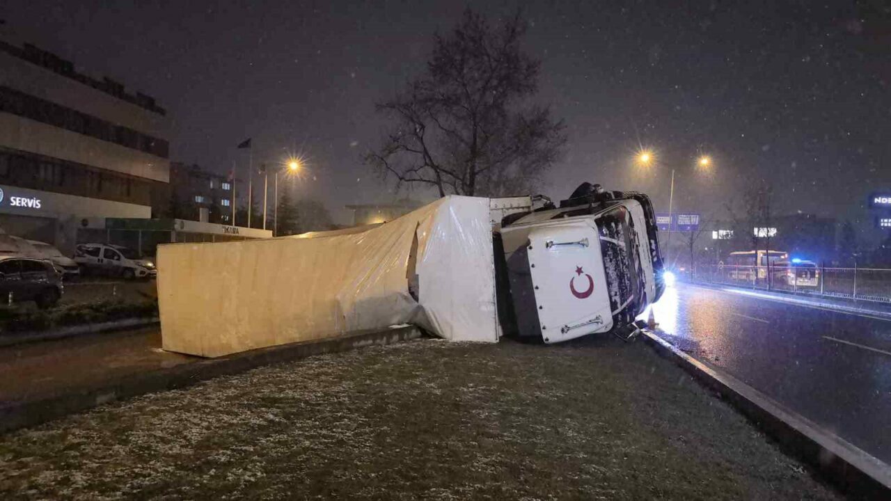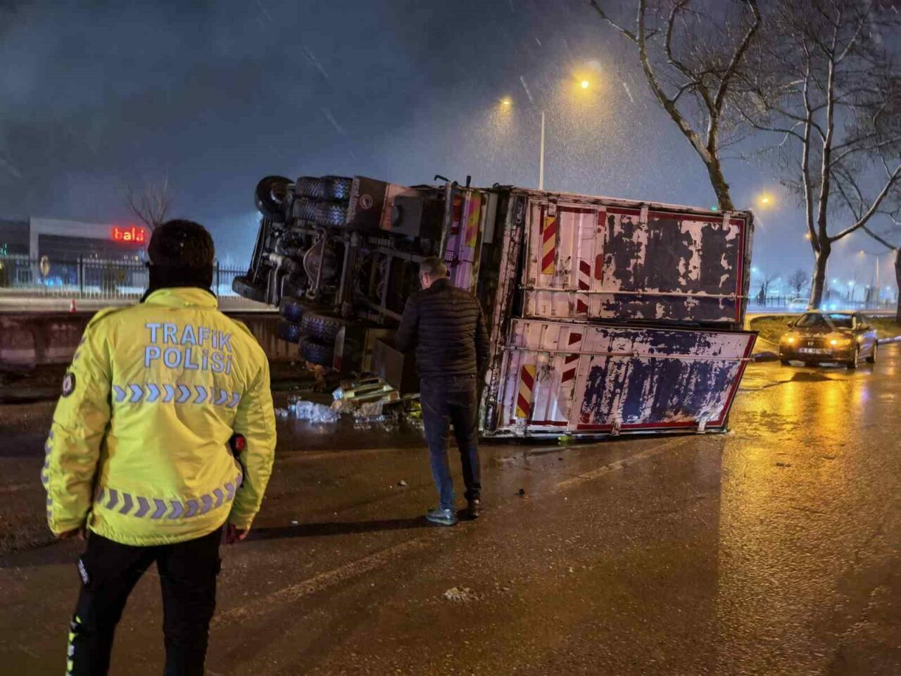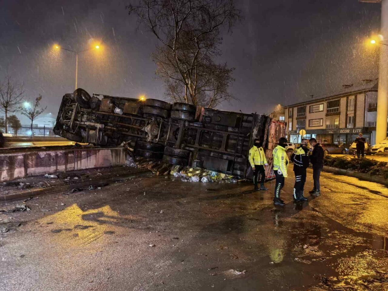 Kaza, saat 19.00 sıralarında Bursa-Ankara karayolu üzeri İnegöl girişinde meydana geldi. Bursa’dan İnegöl’e seyir halinde olan Bünyamin B. (47) idaresindeki 16 AVD 445 plakalı içecek yüklü kamyon, sürücüsünün kontrolünden çıkarak alt yola devrildi.
