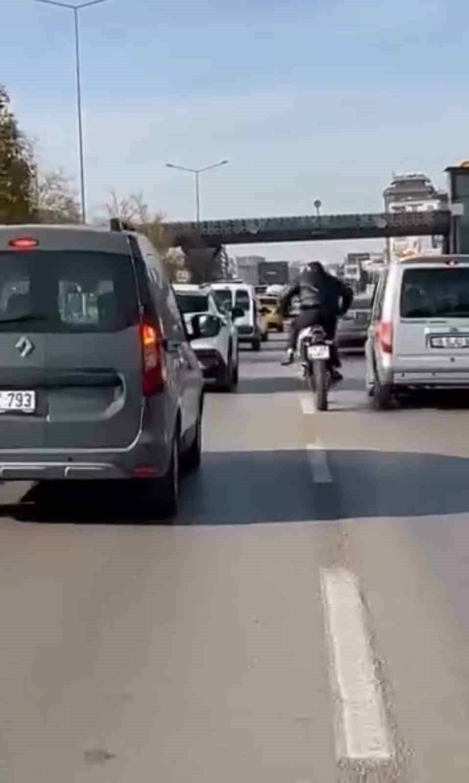 Yoğun trafikte araçların arasından kıvrak hareketlerle geçen sürücünün, motosikleti bir ulaşım aracı gibi değil de adeta bir gösteri sahnesi gibi kullandığı gözlendi.