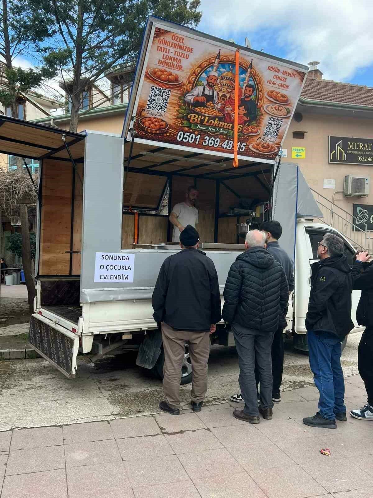 İnegöl Sani Konukoğlu Camii önünde kurulan lokma aracında vatandaşlara ikramda bulunulurken, lokma aracına asılan “Sonunda o çocukla evlendim” yazısı dikkat çekti. Lokma dağıtımı çevredeki vatandaşlar tarafından ilgiyle karşılandı.