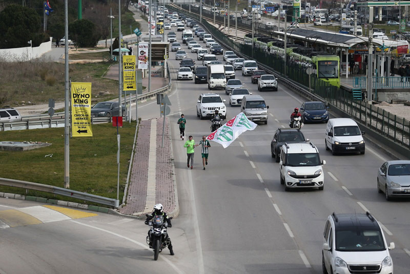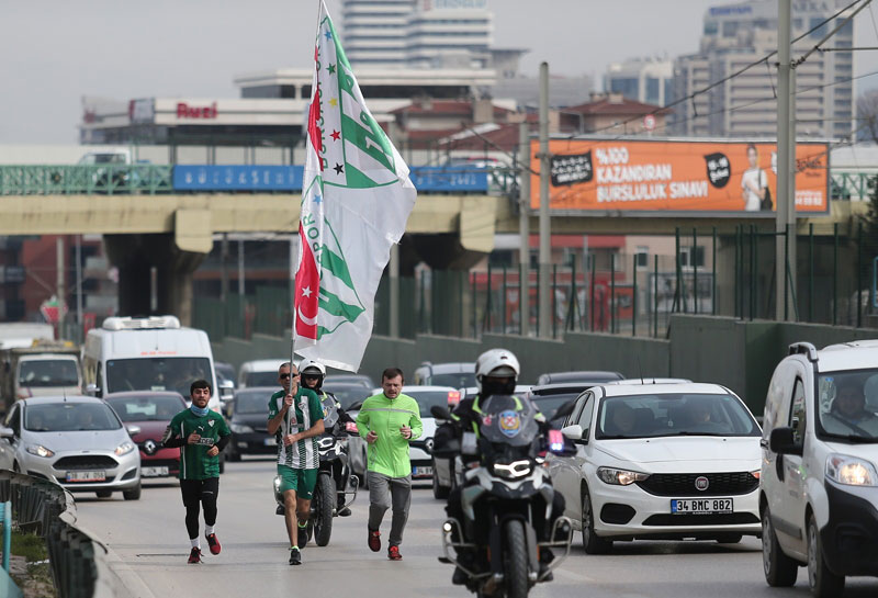 4 metrelik Bursaspor bayrağı ile koşan Avcı ve arkadaşlarına 2 motosikletli polis eskort olarak eşlik etti.